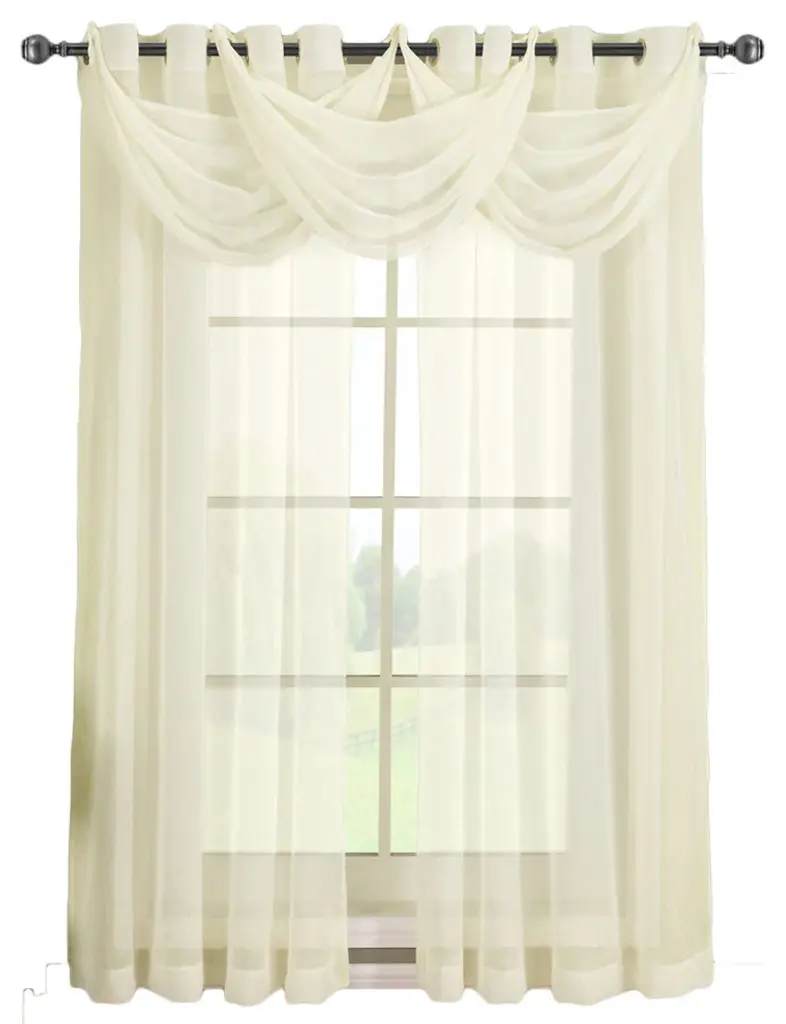 Add an opulent and deluxe look to almost any room in the house with this Grommet Sheer Curtain Panels by Abripedic. Opt from the seven delightful different colors available that perfectly complements any room. Have an informal appearance with the panels only or add more elegance with one or more waterfall valances. Add the valance scarf to complete the look. See-through and delicate, the Abripedic Grommet Crushed Sheer Curtain Panel looks dreamy blowing in the breeze. These long, sheer curtains can be hung alone or under solid drapes. •100% polyester Sheer Curtains•Sold individually (Not a set, each package contains only one panel or one valance)•Allows light to softly enter the room•Crushed sheer creates fresh & rich atmosphere•Ability to mix and match different color valances with other colored panels •Machine-washable Easy CareAvailable Sizes Include: (Not a set, Sold as single panel or single valance)•24 " wide x 24 " long each Valance•50 " wide x 63 " long each Panel•50 " wide x 84 " long each Panel•50 " wide x 96 " long each Panel•50 " wide x 108 " long each Panel