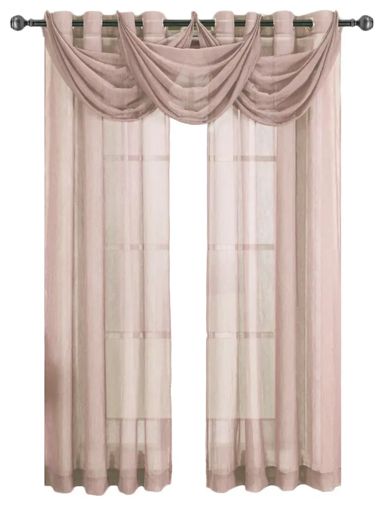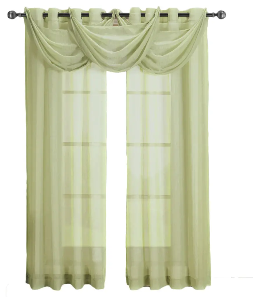 Add an opulent and deluxe look to almost any room in the house with this Grommet Sheer Curtain Panels by Abripedic. Opt from the seven delightful different colors available that perfectly complements any room. Have an informal appearance with the panels only or add more elegance with one or more waterfall valances. Add the valance scarf to complete the look. See-through and delicate, the Abripedic Grommet Crushed Sheer Curtain Panel looks dreamy blowing in the breeze. These long, sheer curtains can be hung alone or under solid drapes. •100% polyester Sheer Curtains•Sold individually (Not a set, each package contains only one panel or one valance)•Allows light to softly enter the room•Crushed sheer creates fresh & rich atmosphere•Ability to mix and match different color valances with other colored panels •Machine-washable Easy CareAvailable Sizes Include: (Not a set, Sold as single panel or single valance)•24 " wide x 24 " long each Valance•50 " wide x 63 " long each Panel•50 " wide x 84 " long each Panel•50 " wide x 96 " long each Panel•50 " wide x 108 " long each Panel