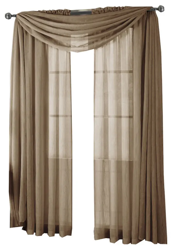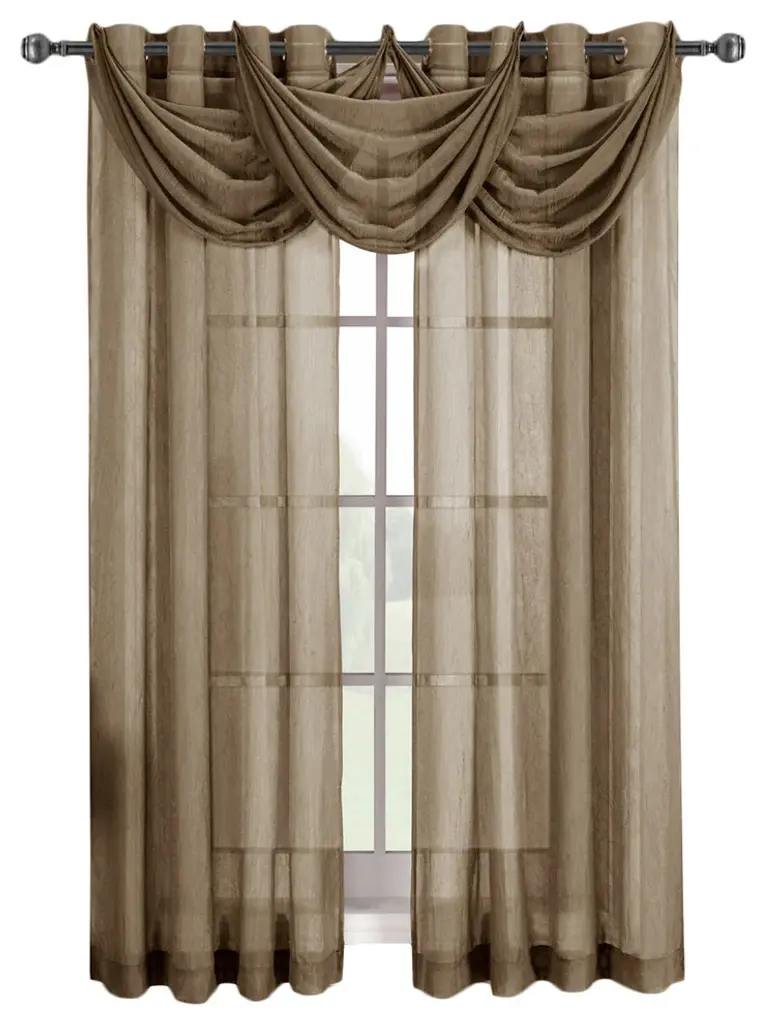 Add an opulent and deluxe look to almost any room in the house with this Grommet Sheer Curtain Panels by Abripedic. Opt from the seven delightful different colors available that perfectly complements any room. Have an informal appearance with the panels only or add more elegance with one or more waterfall valances. Add the valance scarf to complete the look. See-through and delicate, the Abripedic Grommet Crushed Sheer Curtain Panel looks dreamy blowing in the breeze. These long, sheer curtains can be hung alone or under solid drapes. •100% polyester Sheer Curtains•Sold individually (Not a set, each package contains only one panel or one valance)•Allows light to softly enter the room•Crushed sheer creates fresh & rich atmosphere•Ability to mix and match different color valances with other colored panels •Machine-washable Easy CareAvailable Sizes Include: (Not a set, Sold as single panel or single valance)•24 " wide x 24 " long each Valance•50 " wide x 63 " long each Panel•50 " wide x 84 " long each Panel•50 " wide x 96 " long each Panel•50 " wide x 108 " long each Panel