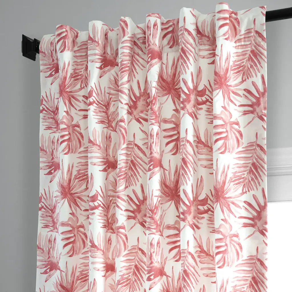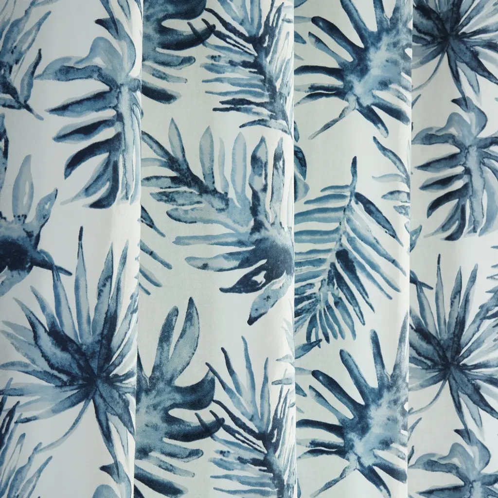 ARTEMIS BLUE TEAL is a soft light twill drape and curtain, fully lined and an inspired decorative backdrop to any space for any goddess. A tossed palm leaf inspired print in watercolor tints of aqua, teal and blue like the sea. The light blue color background is barely there and just enough for an overall cool tone.