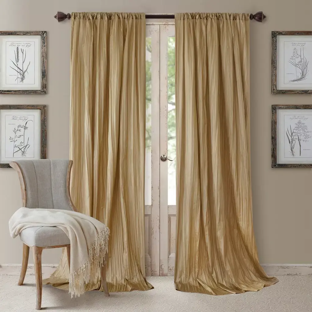 The Athena curtains offer an elegant, crushed silk look that adds dramatic flair to any room. Drapery set includes two window panels and a coordinating scarf valance. Luxurious fabric drapes beautifully and allows the perfect amount of natural light in any room. 3 inch rod pocket is recommended with up to a 1.5 inch rod for maximum movement. Sold as a set. 100% polyester. Easy care, machine washable.
