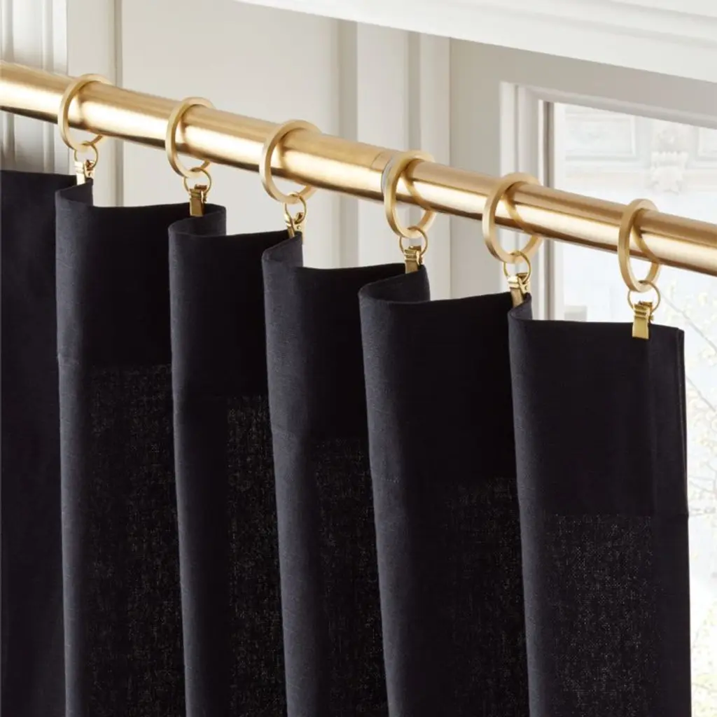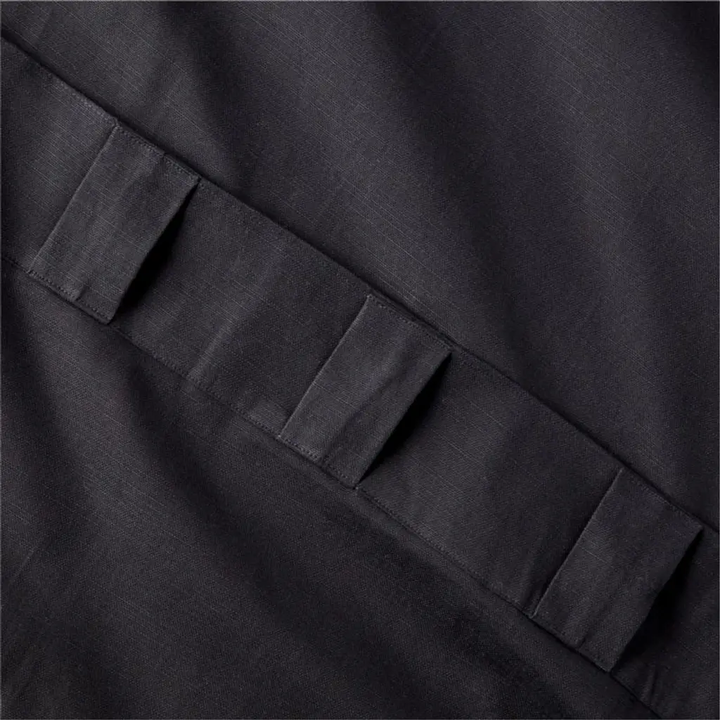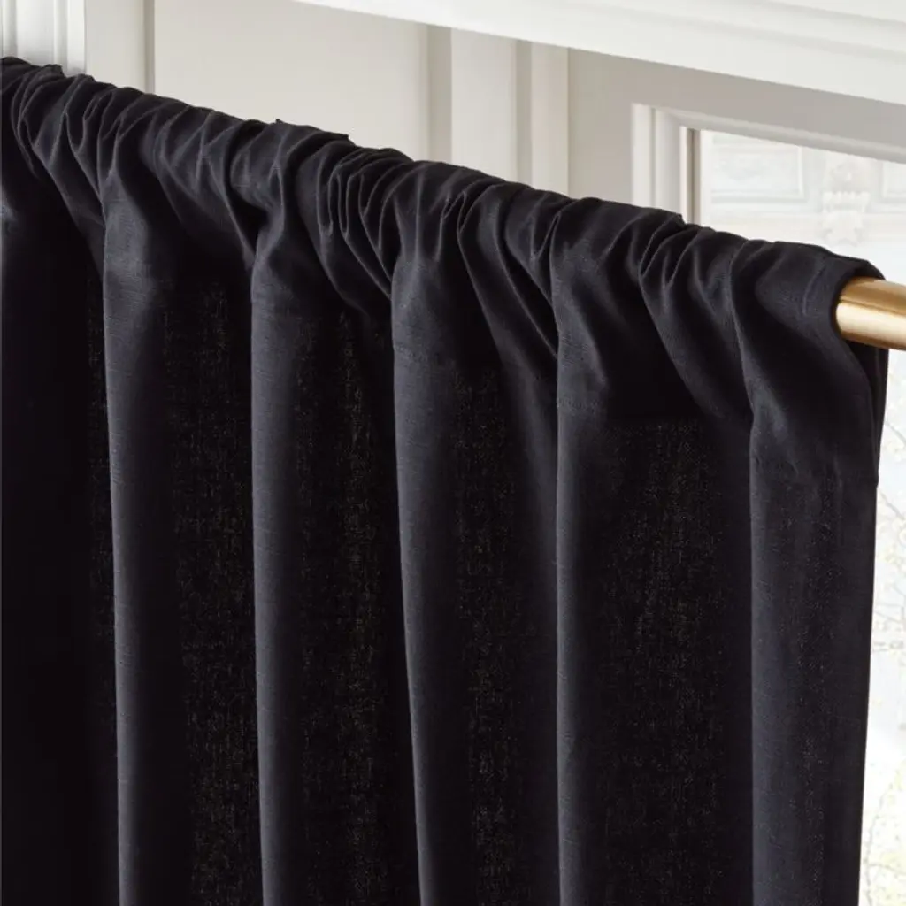 Tightly woven of cotton, black curtain panel provides privacy with solid presence. Pair with sheer French-Belgian linen panel on a double curtain rod for a layered effect. Hangs beautifully with back tabs or rod pocket. CB2 exclusive.
