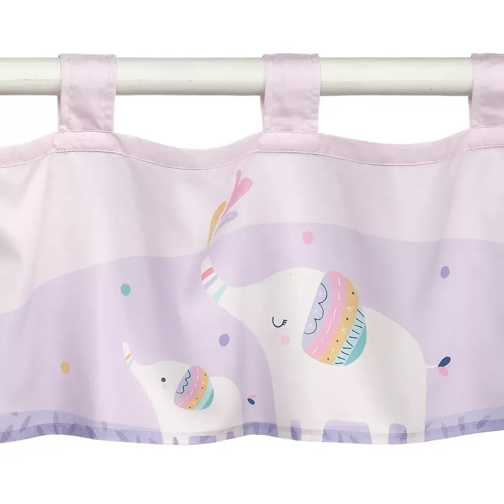 This pretty pastel window valance features a mommy and baby elephant with colorful ears along with palm trees, leaves, and a light pink sky. The valance is 54” long with a total height of approximately 13.5 inches. It adds the finishing touch to your child’s room. Made in a soft microfiber material it is durable and machine washable for easy care.