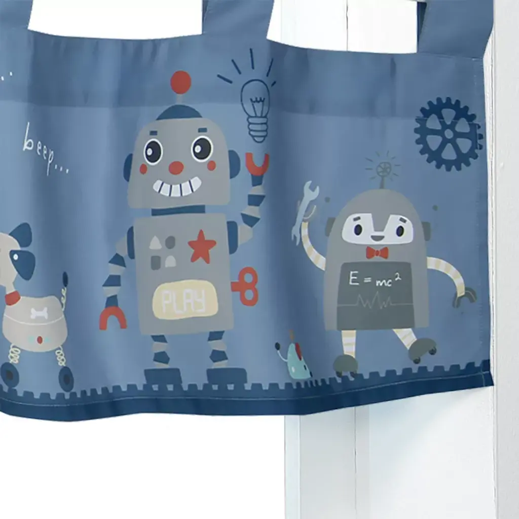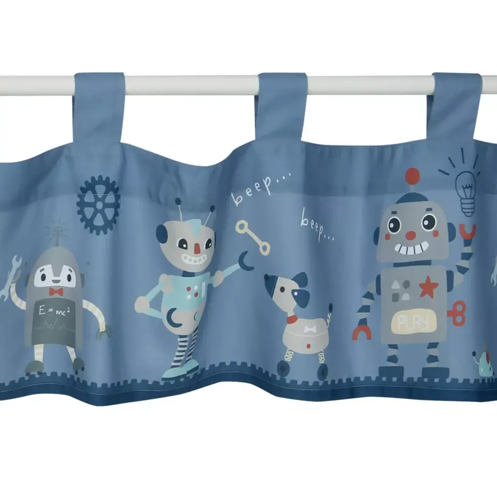 Complete the look of this fun filled nursery with this colorful window valance. It softens the look of the window and coordinates perfectly with the Robbie Robot bedding set by Bedtime Originals or can be used as an accent with your own room design. It is 54” long X 13.5” high including the tabs. There are seven 3” tabs on top for easy hanging using a standard rod (rod not included). It has a dusty blue background, is cute and colorful and has a navy-blue trim at the bottom.