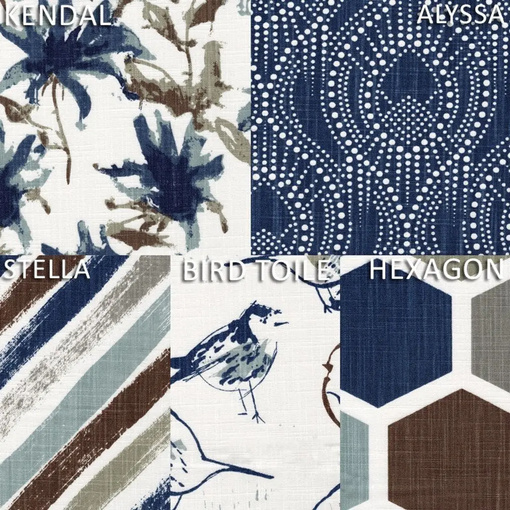 Bird Toile is a contemporary take on a chinoiserie featuring minimalist earth-tone birds that face in opposite directions. The fabric is a cotton slub canvas in soft navy, spa blue, brown, khaki, and white. Includes one tailored valance, lined. Total Size is 52" wide x 17" long. Length is measured from the top of the rod pocket to the bottom edge. 3" rod pocket, 2" header, 3" hem. Valance is screen printed 100% Cotton Slub Canvas. The lining fabric is an ivory cotton/polyester blend. Dry cleaning is recommended. Your bedding, window treatments, and home accents are MADE TO ORDER in our North Carolina sewing room so please allow 2-3 weeks for delivery of your specially made pieces.Coordinating patterns in the Collection: Kendal Regal Blue, Alyssa Regal Blue, Bird Toile Regal Blue, Hexagon Regal Blue, Stella Regal Blue.
