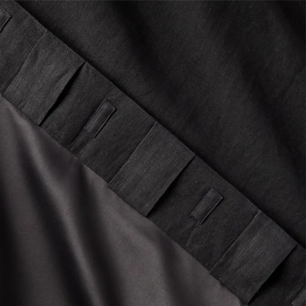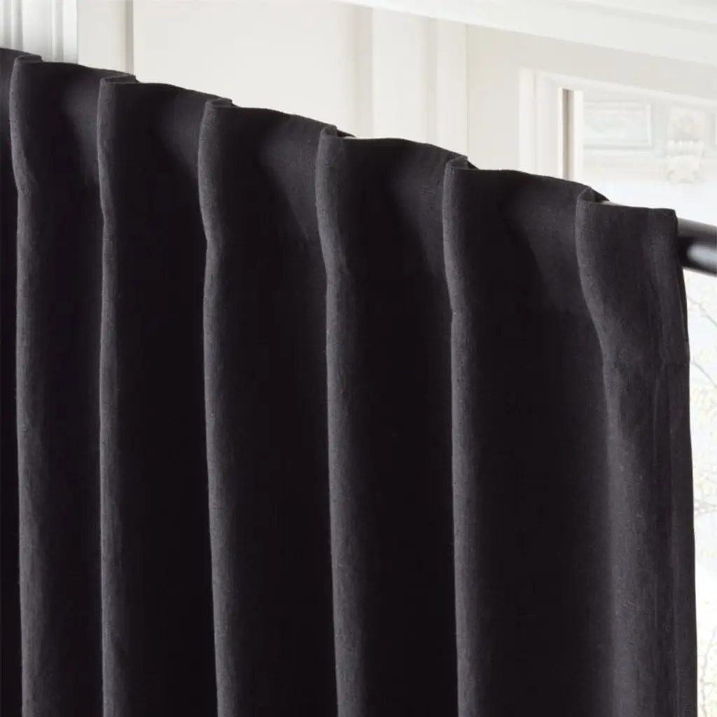 Blackout black linen is woven from natural flax grown in Europe. Opaque lining blocks out light with a clean hem on the seams for a tailored look. Hangs beautifully with back tabs, rod pocket or drapery hooks. CB2 exclusive.