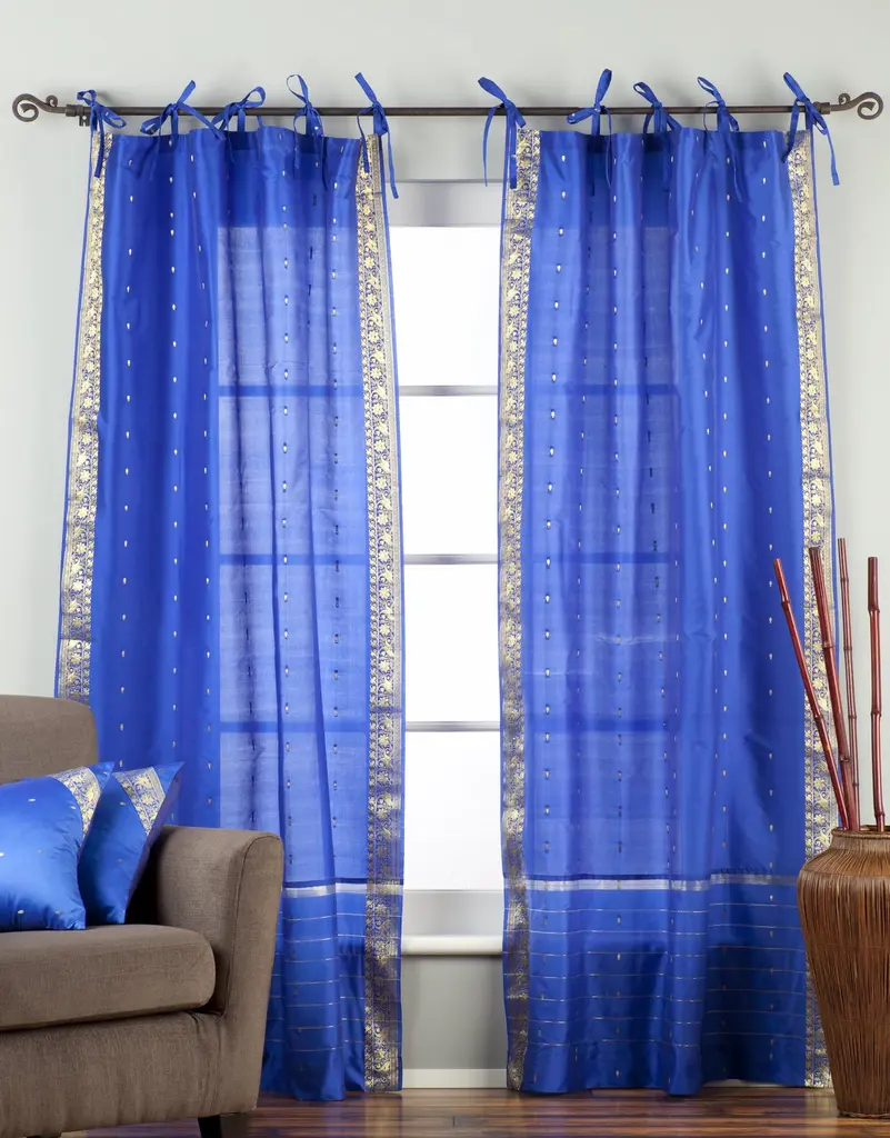Add splendor to any room in your home with these Tie Top sari sheer curtains from India. These handmade drapes are heavily bordered with excellent artwork Sari Curtains / Drapes / Panels are the perfect choice for those looking for light, elegant drapes with a touch of luxury. It has smooth finish with a soft sheen and feels gentle and cool to the touch. Sheer curtains made of saris allow light in through windows but prevent people looking in when they are drawn. Story Behind the Art: The fabric of these curtains are weaved on a hand-loom in a small rural village in India and then hand-dyed. The artisans are a group of young hand-crafters who have moved from small villages to a big town in Central India and make various home decor items out of these exotic sari fabrics. This gives these wonderful artisans a way to have sustainable income via selling to the worldwide market on the internet. Your purchase supports local and home-based work where the artisans can easily tend to their families and pass these time-honored skills from one generation to the next.