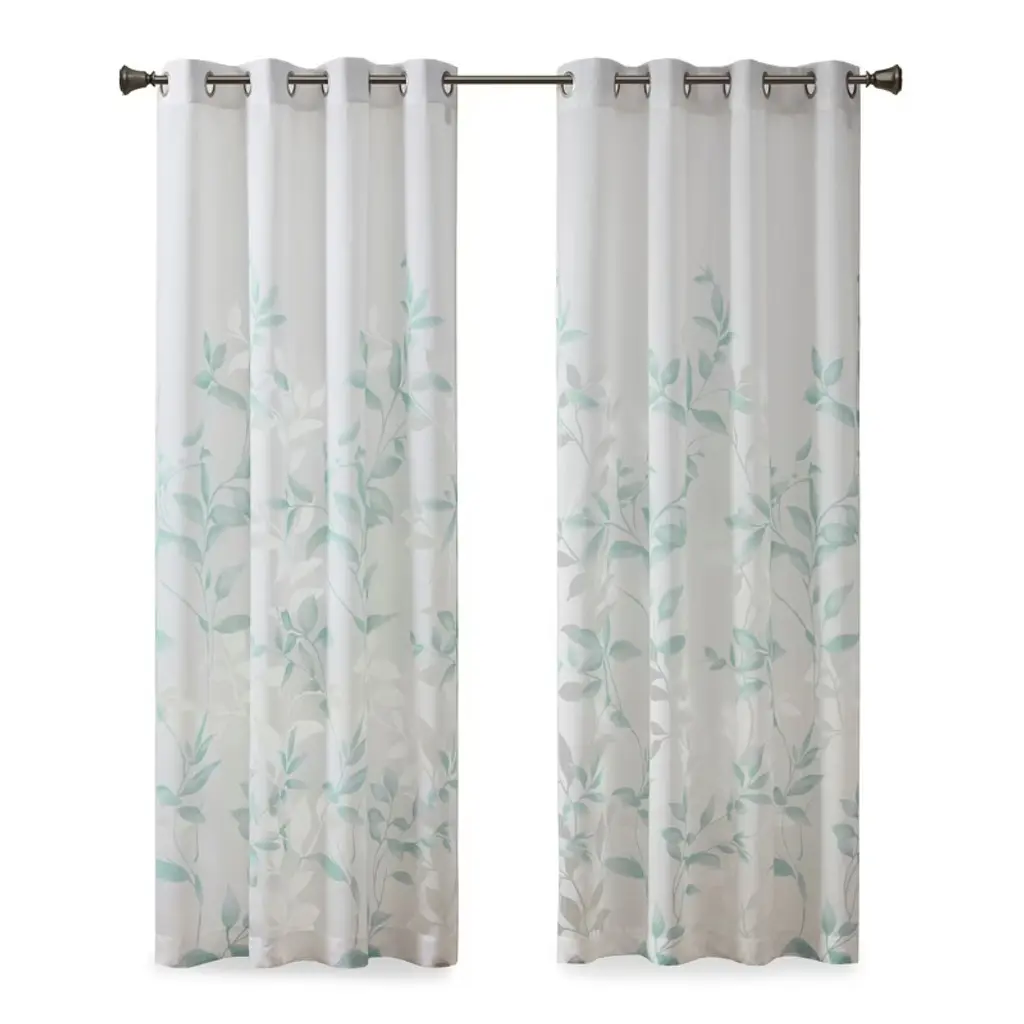 Description Transform any room with the beauty of our Madison Park Cecily Printed Window Panel. The gorgeous panel flaunts a stunning all over aqua botanical design burned out for a dimensional and fresh update. Finished with silver grommet tops for easy hanging, this panel revitalizes your d¨¦cor with its alluring design and modern color scheme. This window panel is also OEKO-TEX certified, meaning it does not contain any harmful substances or chemicals, ensuring quality comfort and wellness. Product Details 50x84" 1 Window Panel:50"W x 84"L Material 65% Rayon 35% Polyester Burned out