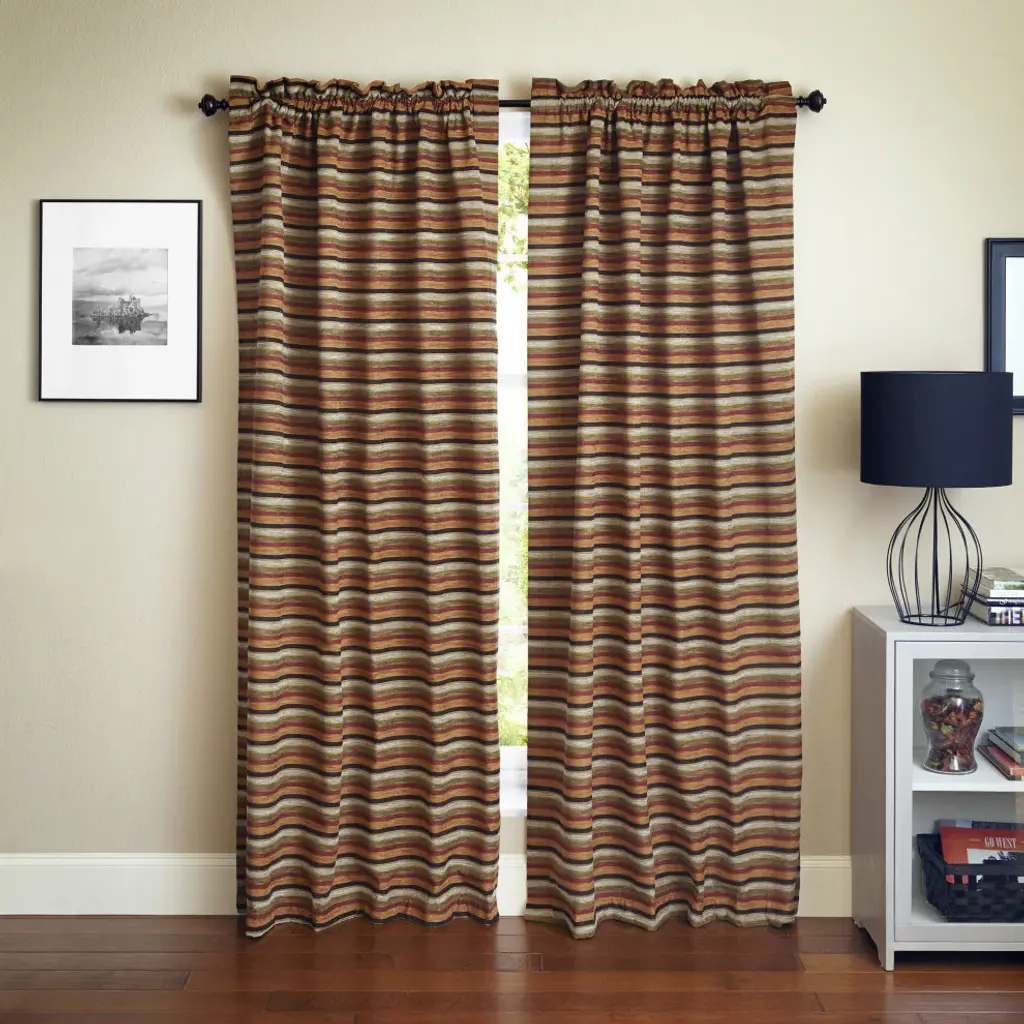 The Calhoun Ensemble by HiEnd AccentsVibrant serape-inspired stripes anchor this appealing set, which is perfectly paired with understated stripes, rich faux leather, and soft suede. Turquoise accents provide the finishing touch.The Calhoun valance measures 84x18? and features rod pocket hanging for a finished look. Coordinating curtains, decorative pillows, bedding, and other Calhoun accessories are available separately.The Lifestyle Rustic Collection by HiEnd Accents offers affordable luxury to those seeking a fashionable rustic look in their home. From quality window treatments, to decorative accessories, dinnerware, and bedding, the Lifestyle Rustic Collection provides the details that bring style and comfort into a home.