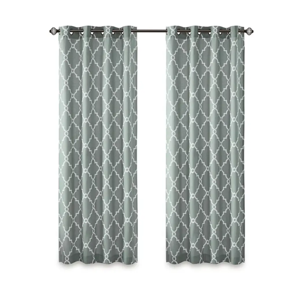 This window panel features a trendy light beige fretwork on a seafoam ground, creating a simple yet modern look. The cotton blend basket weave fabric softly filters the perfect amount of sunlight into your home, while providing texture for natural appeal. Gunmetal grommet top detail makes this panel easy to hang, open, and close throughout the day. Fits up to a 1.25" diameter rod. Pattern position may vary per panel due to random cutting of fabric.