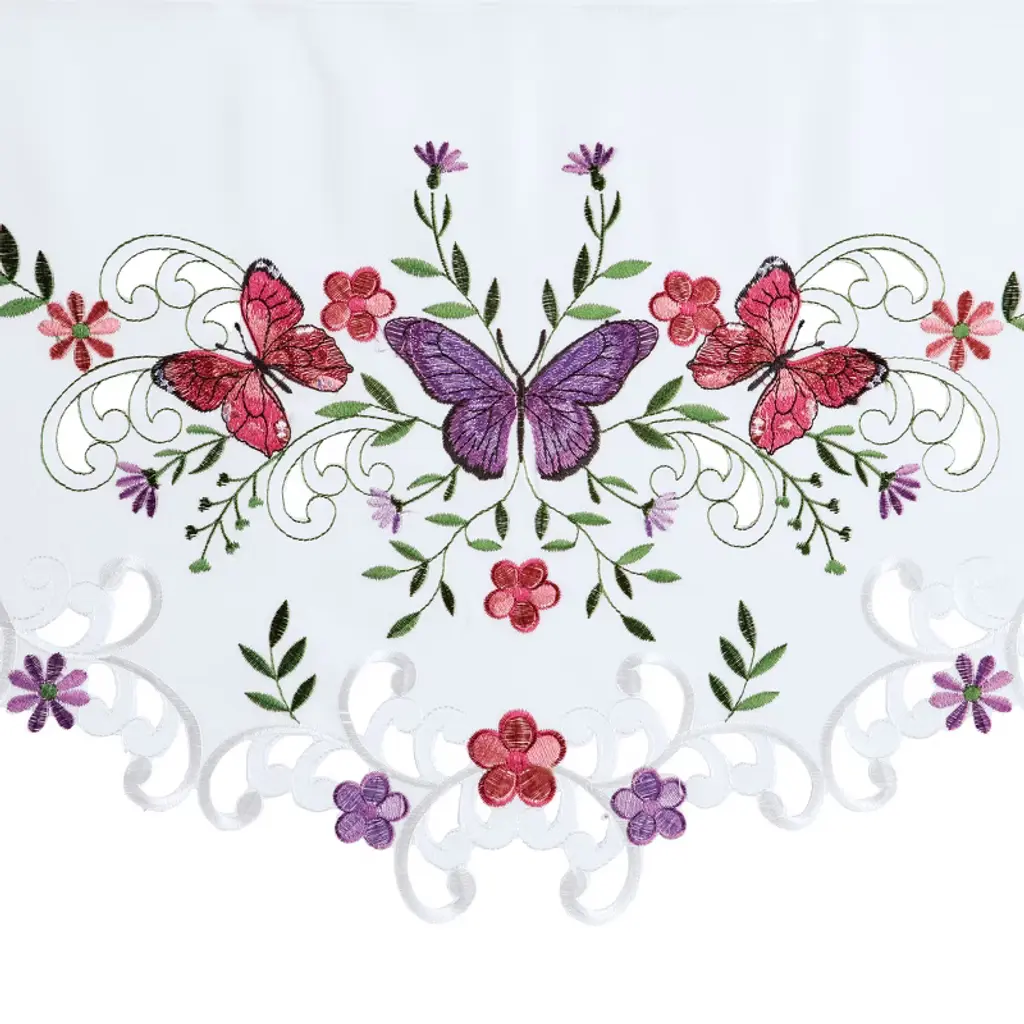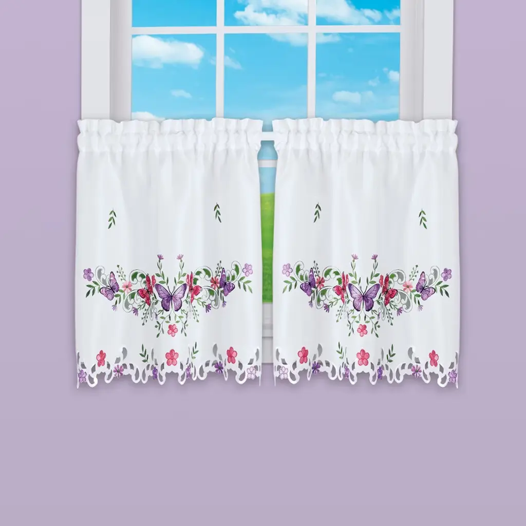 These Curtains Have A Lovely Design Featuring Pink And Purple Butterflies With Green Embroidery And Delicate Cutouts. Rod Pocket Tops Make Hanging Easy. Machine Wash. Polyester; Imported. Choose: Valance (14"L X 58"W) Or Swag Pair (36"L X 29"W Each), 24" Tier Pair Set Of 2 (24"L X 29"W Each) Or 36" Tier Pair Set Of 2 (36"L X 29"W Each).