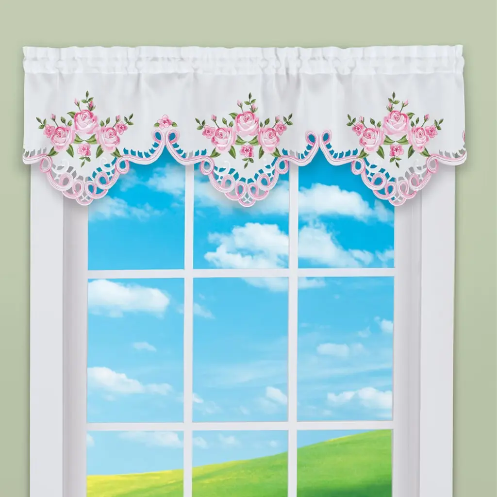 Collections Etc Embroidered Sweet Roses Intricate Cut-out Window Valance Pink