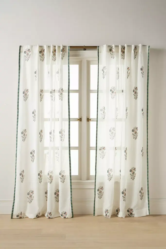 A subtle symmetrical freesia motif, embroidered striped trim, and gauze fabrication offers an ethereal feel, perfect for a romantic living space or bedroom. Ready to *unveil* the secrets to choosing and hanging curtains? [Read our guide](https://www.anthropologie.com/home-curtains-guide) so you can easily find the *perfect* styles for your home, sweet home. **Light Control**: semi-sheer For ordering assistance and more, please [contact us](https://www.anthropologie.com/help/contact-us#contact-us-section-2). For aesthetic advice and tips to help decorate your space, enjoy our complimentary [home styling services](https://www.anthropologie.com/help/personal-styling-home-decor).