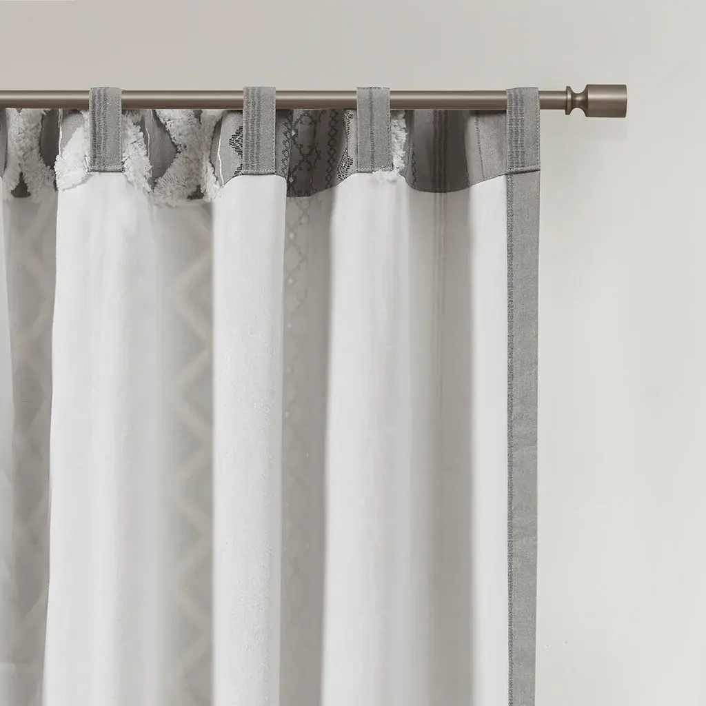 100% cotton printed with tufted chenille stripe trim window curtain panel; Textured artisanal look and feel; Single panel item measures 50" wide; Recommended 2 panels for standard coverage; Rod pocket and back tab finish; Fits up to 1.25 inches rod in diameter; Added cotton lining for light filtering and more privacy; Oeko-Tex Certified, includes no harmful substances or chemicals