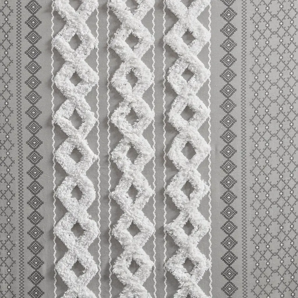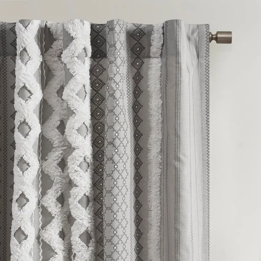 The INK+IVY Imani Cotton Printed Window Panel with Chenille Stripe and Lining offers a chic and casual update to your home. This gray window panel features a geometric print with a tufted chenille stripe trim, for a textured artisanal look and feel. A lightweight white cotton lining on the reverse softly filters light, while providing better drapability and added privacy. In addtition, this 100% cotton curtain panel is also OEKO-TEX certified, meaning it does not contain any harmful substances or chemicals for the best in quality comfort and wellness. Each panel is finished with a rod pocket top for easy hanging, and back tabs for a more clean and tailored finish. This window panel is sold as a single and 2 window panels must be purchased to cover any standard size window. Complete the look with coordinating bedding sets and bath decor, available and sold separately. Product Details 50x84" 1 Window Panel:50"W x 84"L Material 100% cotton, printed and tufted with chenille, with cotton lining on the back. Finished with rod pockets and back tabs; fits up to 1.25 inches diameter rod.