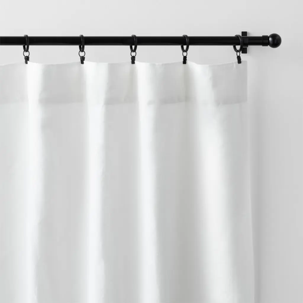 Sustainable linen weaves a luxurious blackout curtain in bright white. Washed for enhanced softness, the curtain panel drapes beautifully while blocking unwanted illumination from outdoors. Hang our exclusive linen curtain with blackout liner from the back tabs for an elegant pleated style, use the rod pocket to create a more laid-back gathered look or add a set of our curtain clips (sold separately).Curtain hardware also available.Learn how to hang curtains in our guide.