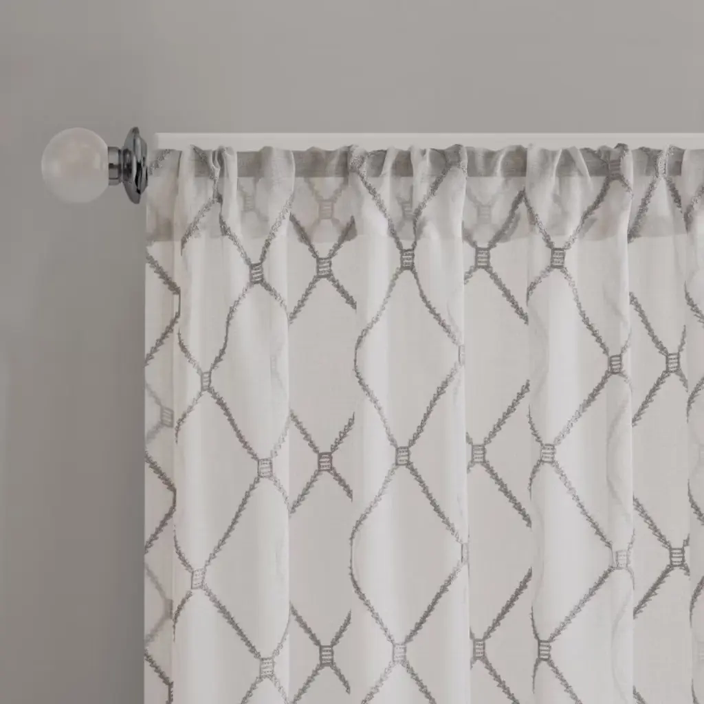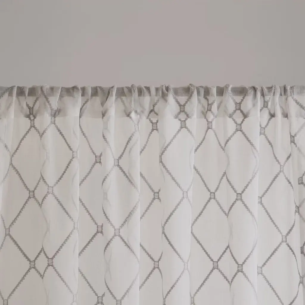 Description Madison Park¡¯s Irina Diamond Sheer Window Curtain provides an alluring update to your home. An elegant diamond pattern is beautifully embroidered on a soft sheer fabric, adding grace and charm to your d¨¦cor. The neutral colors and light fabric helps create a delicate look to soften any room. Hang this sheer window curtain using the rod pocket for a simple finish. Fits up to a 1.25in diameter rod. Product Details 50x95in 1 Window Curtain:50x95in Material 100% Polyester with Embroidery, Rod Pocket