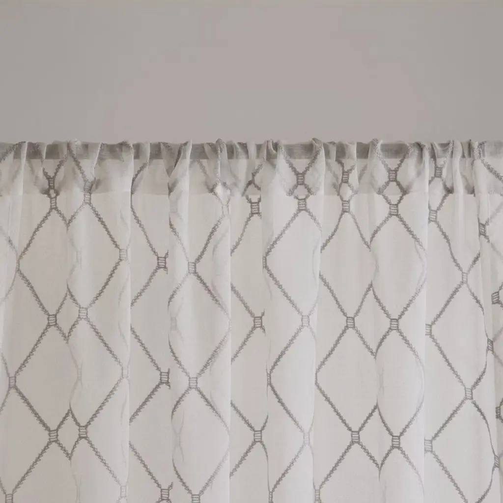 Description Madison Park’s Irina Diamond Sheer Window Curtain provides an alluring update to your home. An elegant diamond pattern is beautifully embroidered on a soft sheer fabric, adding grace and charm to your décor. The neutral colors and light fabric helps create a delicate look to soften any room. Hang this sheer window curtain using the rod pocket for a simple finish. Fits up to a 1.25" diameter rod. Product Details 50x95" 1 Window Curtain:50x95" Material 100% Polyester with Embroidery, Rod Pocket