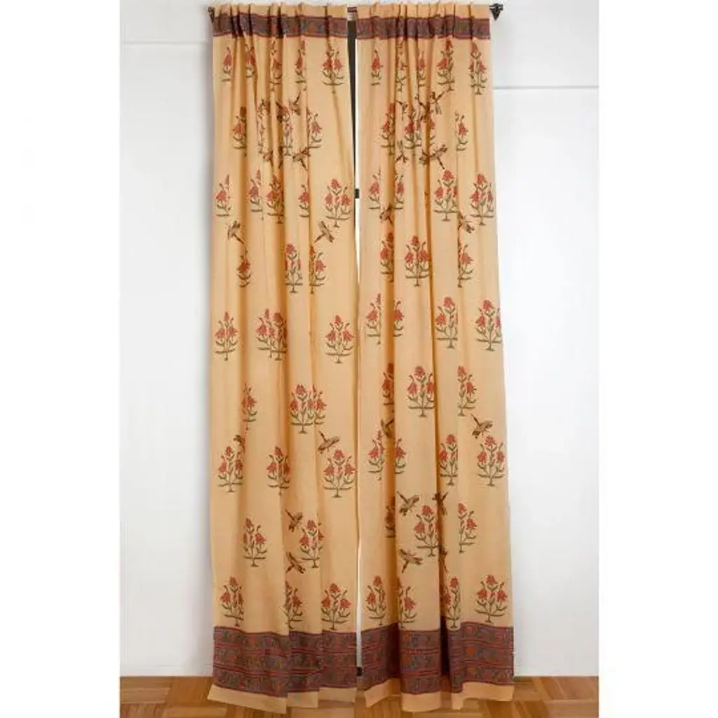 Often spotted after monsoon rains, the happy dragonfly is paired with pretty florals to create these cheerful linens. After being dyed a warm mustard yellow, the cotton is first printed with an all over design before the motifs are applied. A beautiful floral border printed against a teal gray background adds the finishing touch. Made from semi-transparent white cotton voile, our block printed curtains make a gentle veil for your windows that offers both privacy and light. Hand-printed using woodblock printing techniques that produce subtle variations in design, these panels illustrate classic Indian and nature-inspired motifs that suggest casual, organic elegance. Our all-natural curtains create a calming gateway between inside and out—helping you to relax the minute you get home. Materials: Cotton voile. Crafts: Hand block printing. DIMENSIONS 45" wide x 96" long CARE & MAINTENANCE Protect from direct sunlight when using. Hand or machine wash separately in cold water on gentle cycle. Use a mild detergent without any bleach or fabric softeners. Do not soak or wring the fabrics. Scrub gently if needed. Tumble dry on low heat or air dry in the shade. Iron at medium setting. Test stain remover on a small area before applying.
