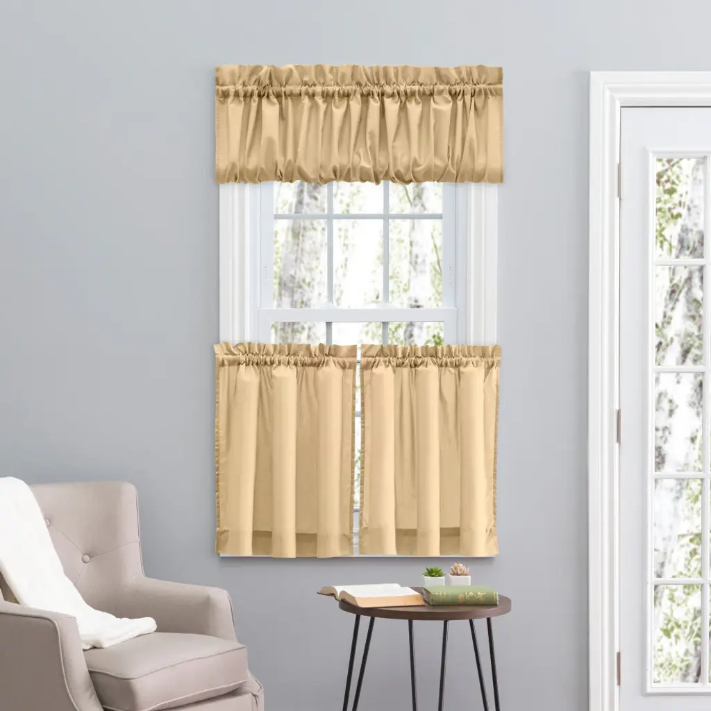 Ellis Curtain Stacey Balloon Valance"”Bring beauty and a brand new look into your home décor with the Stacey Curtain Program. The popular solid colors coordinate easily with a variety of other solids, checks, plaids, and stripes without over powering them. The Stacey Balloon Valance is engineered form a lighter fabric that is designed to allow some light in while providing privacy. Made with 70-percent polyester/30-percent cotton fabric creates a smooth draping effect, soft texture and easy maintenance. Stacey Balloon Valance is constructed with a 1.5-inch rod pocket, decorative 2.5-inch header and chamber to create the poufy balloon effect. Width is measured overall 60-inches, Length is measured 15-inches from header top (ruffle above the rod pocket) to bottom of valance. For wider windows simply add multiple valances together on the same curtain rod. Stacey Valances can be combined with coordinating Tiers and Swags. Machine Washable.