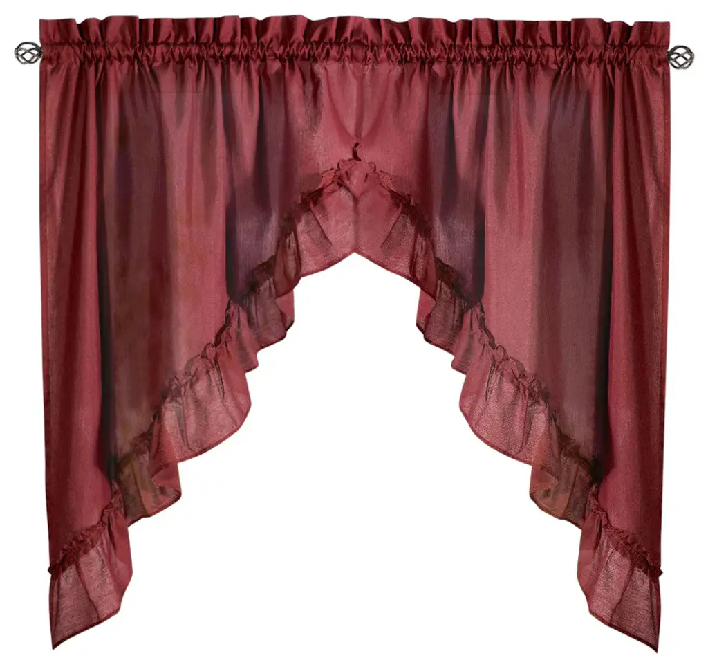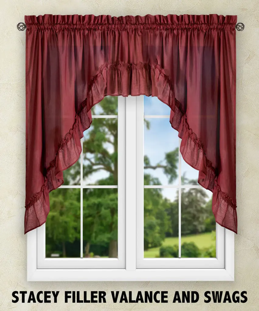 Ellis Curtain Stacey Ruffled Swags"”Bring beauty and a brand new look into your home décor with the Stacey Curtain Program. The popular solid colors coordinate easily with a variety of other solids, checks, plaids, and stripes without over powering them. The Stacey Ruffled Swag curtains are engineered from a lighter fabric that is designed to allow some light in while providing privacy. Made with 70-percent polyester/30-percent cotton fabric creates a smooth draping effect, soft texture and easy maintenance. Each swag panel is constructed with a 1.5-inch rod pocket, 1.5-inch header and decorative 4.5-inch ruffle. Sold in pairs (2 Panels) Width is measured overall 60-inches per pair of panels (both 30-inch panels together) Length is measured overall 38-inches from header top (ruffle above the rod pocket) to bottom of panel. For wider windows and a customized look add one or more Stacey Ruffled Filler Valances between the Swag Panels. Stacey Swag Curtains can be combined with coordinating Stacey Valances and Tailored Tier Curtains. Machine Washable.