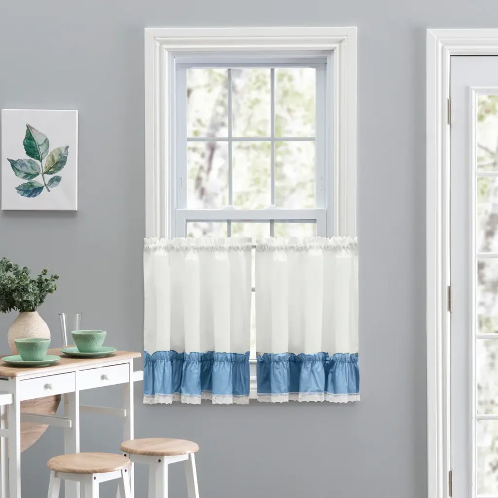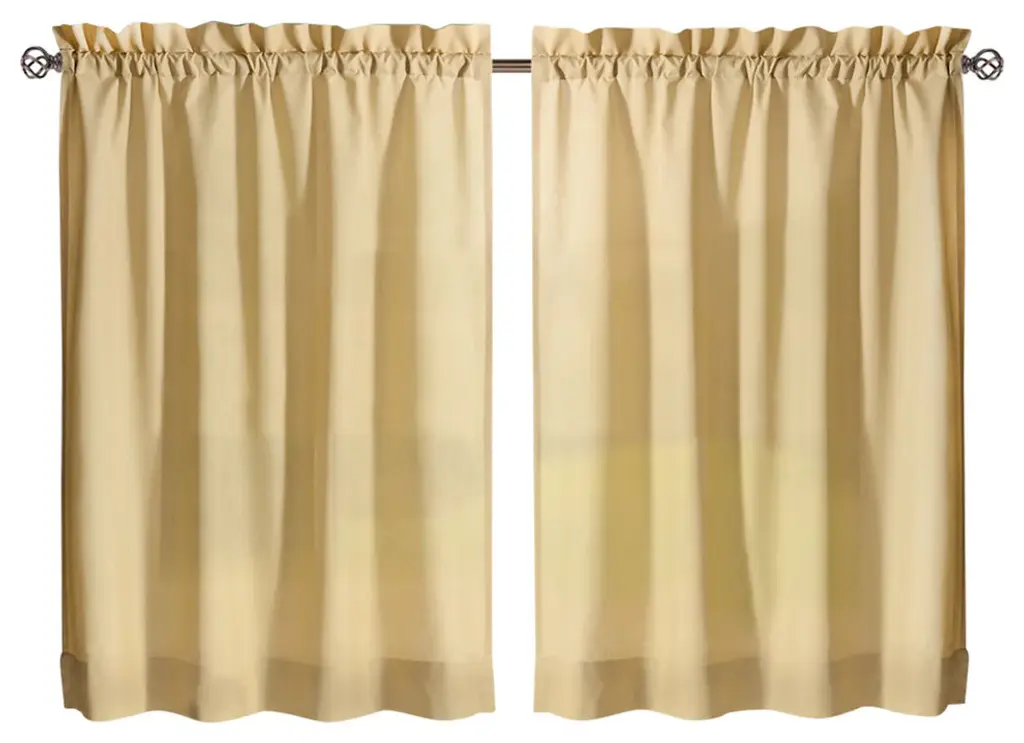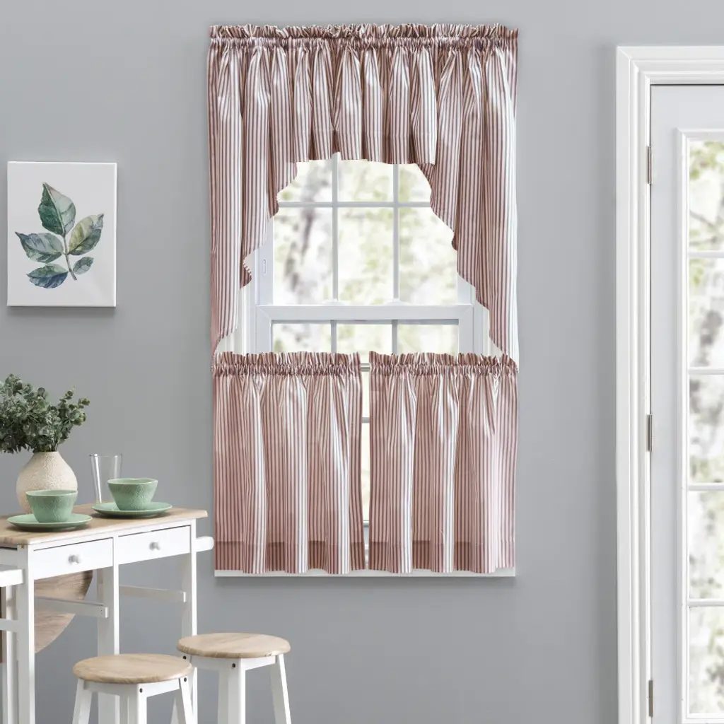 Ellis Curtain Stacey Tailored Tier Pair Curtains"”Bring beauty and a brand new look into your home décor with the Stacey Curtain Program. The popular solid colors coordinate easily with a variety of other solids, checks, plaids, and stripes without over powering them. The Stacey Tailored Tier curtains are engineered form a lighter fabric that is designed to allow some light in while providing privacy. Tailored Tier curtains are used to cover the lower portion of your windows or used alone on shorter length window. Made with 70-percent polyester/30-percent cotton fabric creates a smooth draping effect, soft texture and easy maintenance. Each curtain panel is constructed with a 1.5-inch rod pocket, 1.5-inch header, and 3-inch bottom hem. Sold in pairs (2 Panels) Width is measured overall 56-inches per pair of panels (both 28-inch panels together) Length is measured overall 45-inches from header top (ruffle above the rod pocket) to bottom of panel. For wider windows simply add multiple panels together. Stacey Tailored Tier Curtains can be combined with coordinating Valances and Swags. Machine Washable.
