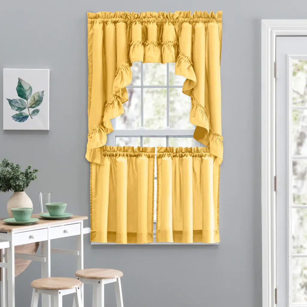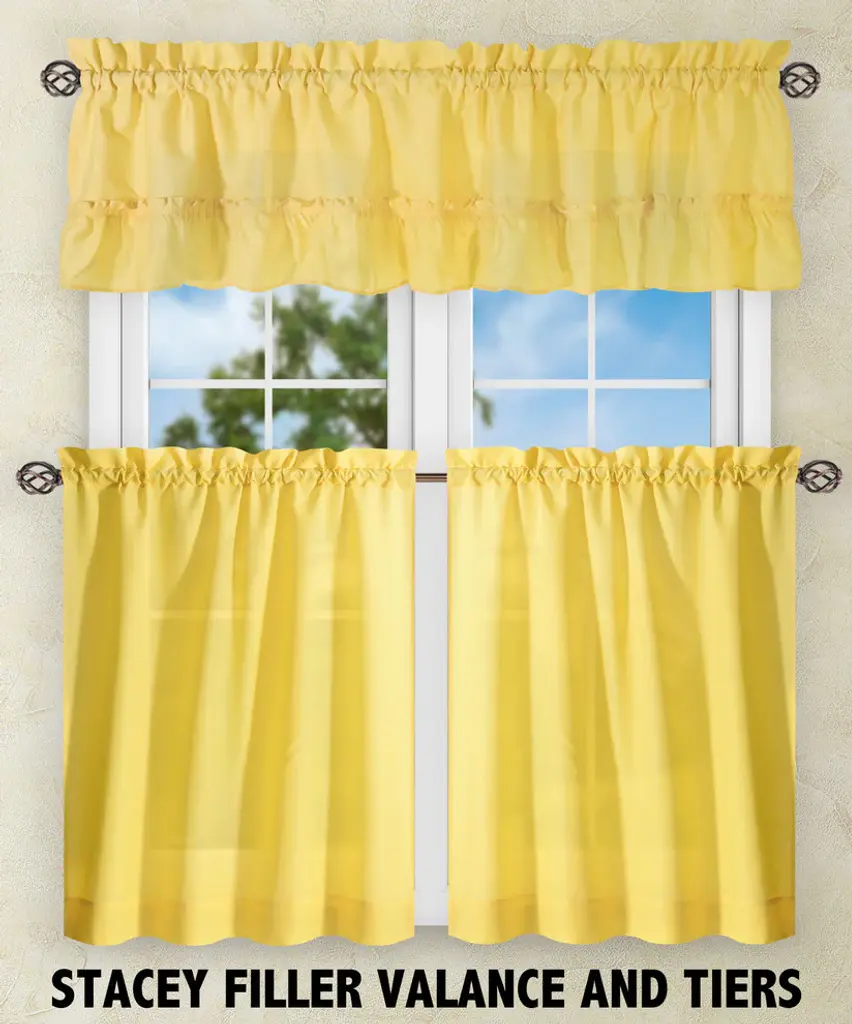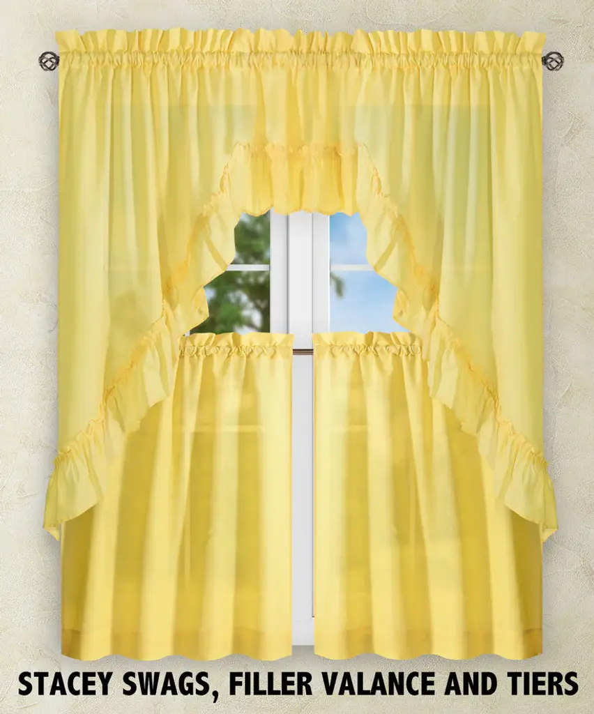 Ellis Curtain Stacey Tailored Tier Pair Curtains"”Bring beauty and a brand new look into your home décor with the Stacey Curtain Program. The popular solid colors coordinate easily with a variety of other solids, checks, plaids, and stripes without over powering them. The Stacey Tailored Tier curtains are engineered form a lighter fabric that is designed to allow some light in while providing privacy. Tailored Tier curtains are used to cover the lower portion of your windows or used alone on shorter length window. Made with 70-percent polyester/30-percent cotton fabric creates a smooth draping effect, soft texture and easy maintenance. Each curtain panel is constructed with a 1.5-inch rod pocket, 1.5-inch header, and 3-inch bottom hem. Sold in pairs (2 Panels) Width is measured overall 56-inches per pair of panels (both 28-inch panels together) Length is measured overall 45-inches from header top (ruffle above the rod pocket) to bottom of panel. For wider windows simply add multiple panels together. Stacey Tailored Tier Curtains can be combined with coordinating Valances and Swags. Machine Washable.
