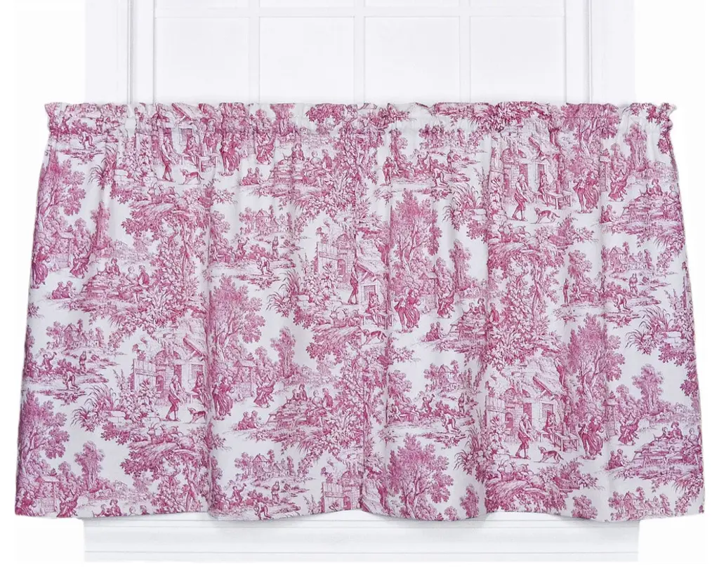 Ellis Curtain Victoria Park Toile Tailored Tier Pair of Curtains--Toile print fabric originated in France in the 18th century and immediately became a popular decorating pattern that still holds true today. The classic country scenes and soft cotton fabric will change and improve the look and feel of any room while adding a touch of style. Made with 100 percent cotton creates a smooth draping effect and softer texture that can''t be achieved with inferior synthetic fabrics. You are sure to get a curtain that. s beautiful and functional in a decorating pattern that''s timeless and long lasting. Tailored Tier curtains are used to cover the lower portion of your windows or used alone on shorter length windows. They are commonly used in bathrooms, bedrooms, kitchens or any other windows where privacy is wanted. Each curtain panel is constructed with a 1. 5'''' rod pocket, 1'''' header, and 3'''' bottom hem. Sold in pairs (2 Panels). -Two Tier Curtains-Rod Pocket-Cotton