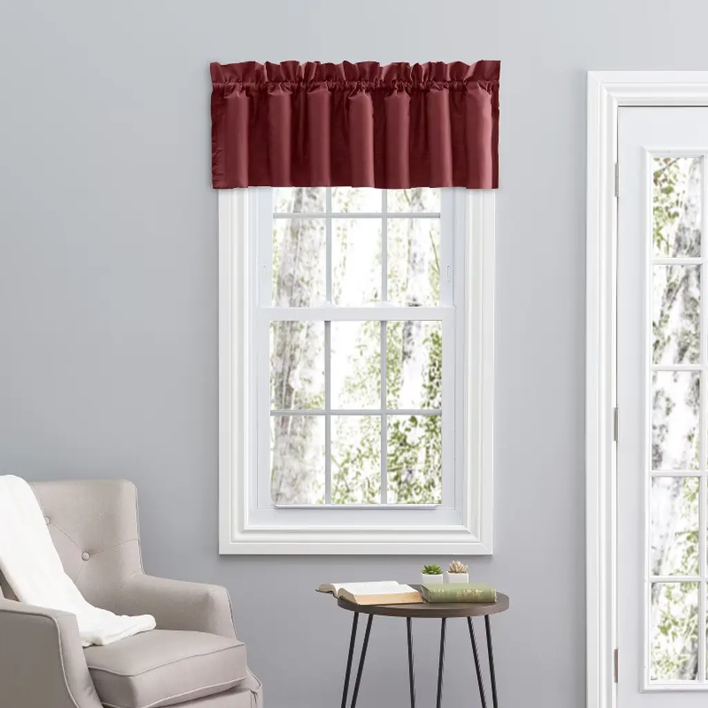 The Ellis Stacey solid color high-quality fabric lined filler valance is made of a blend of 70% polyester and 30% cotton. This has a classic lined and solid color design and a 3" rod pocket. This valance is machine washable and dry. This valance would be a great addition to any room. They are stylish, durable, and easy to care. Measure: 42" x 13". Color: Merlot.