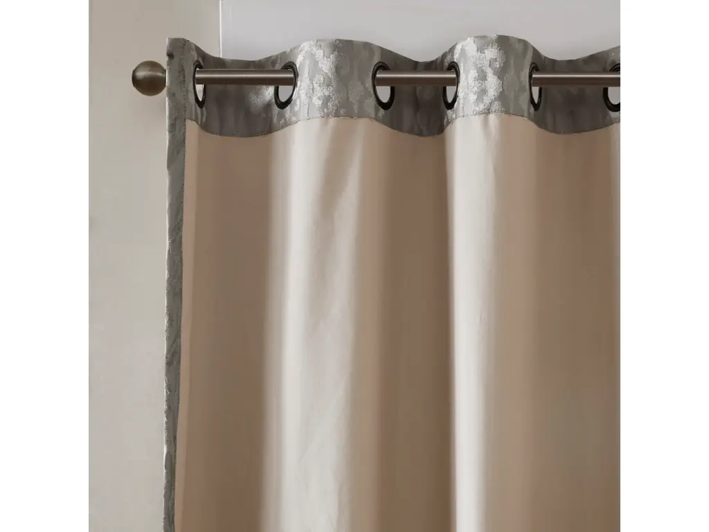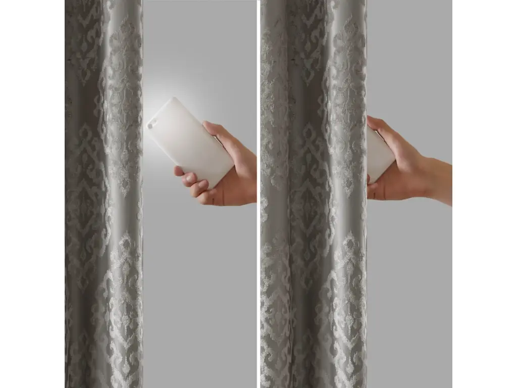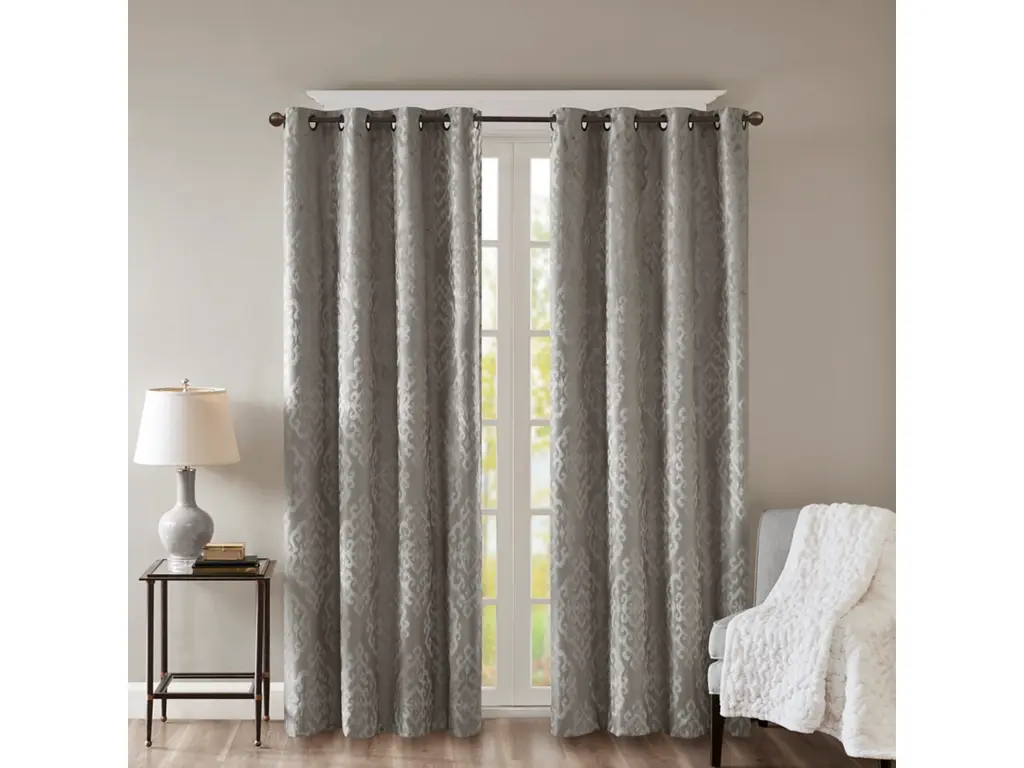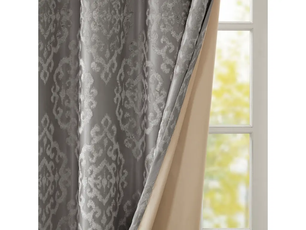 Give your home the lavish style and energy efficiency it deserves with our SunSmart Mirage Knitted Jacquard Total Blackout Panel. This elegant window panel flaunts a knitted jacquard damask design in a rich charcoal hue, creating a luxurious sheen and texture. The heavyweight fabric features a foam-back and bonding finish that blocks out all sunlight and provides a maximum protective barrier against noise intrusion. With 100% total blackout properties, this window panel offers a maximum level of privacy and energy savings, which makes it perfect for bedrooms, media rooms, or any private spaces. A gunmetal grommet top detail completes the look, while also making it easy to hang, open, and close the window panel throughout the day. Fits up to a 1.25” diameter rod. Lighting level: Pitch Black Ambiance.