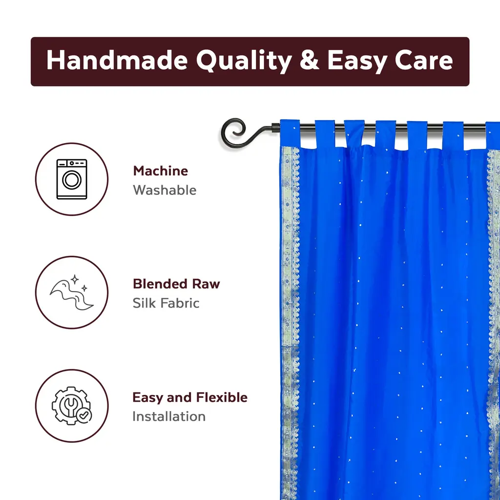 Add splendor to any room in your home with these Tab Top sari sheer curtains from India. These handmade drapes are heavily bordered with excellent artwork Sari Curtains / Drapes / Panels are the perfect choice for those looking for light, elegant drapes with a touch of luxury. It has smooth finish with a soft sheen and feels gentle and cool to the touch. Sheer curtains made of saris allow light in through windows but prevent people looking in when they are drawn. Story Behind the Art: The fabric of these curtains are weaved on a hand-loom in a small rural village in India and then hand-dyed. The artisans are a group of young hand-crafters who have moved from small villages to a big town in Central India and make various home decor items out of these exotic sari fabrics. This gives these wonderful artisans a way to have sustainable income via selling to the worldwide market on the internet. Your purchase supports local and home-based work where the artisans can easily tend to their families and pass these time-honored skills from one generation to the next.