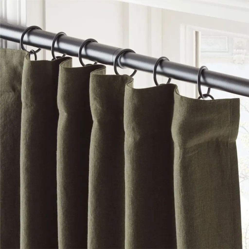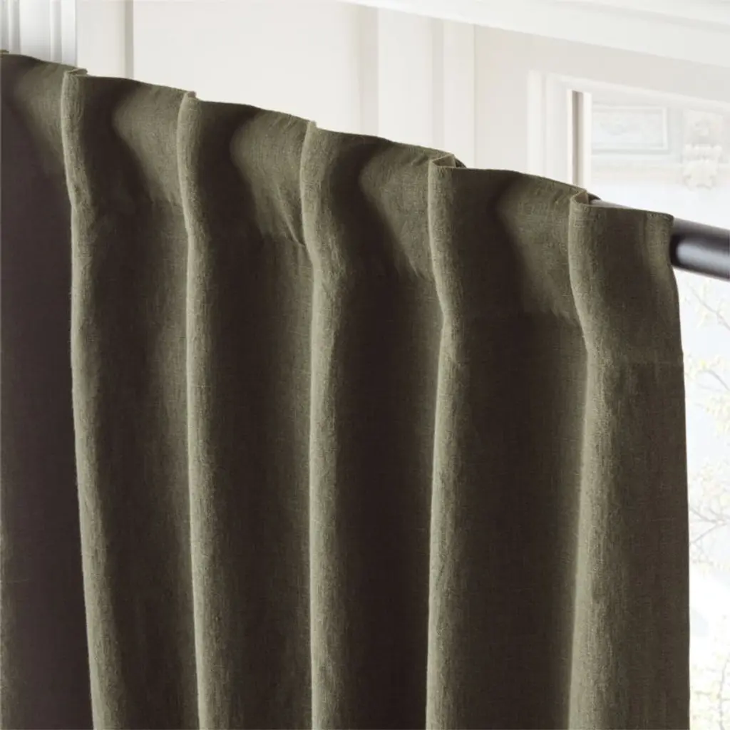 Blackout forest green linen is woven from natural flax grown in Europe. Opaque lining blocks out light with a clean hem on the seams for a tailored look. Hangs beautifully with back tabs, rod pocket or drapery hooks. CB2 exclusive.