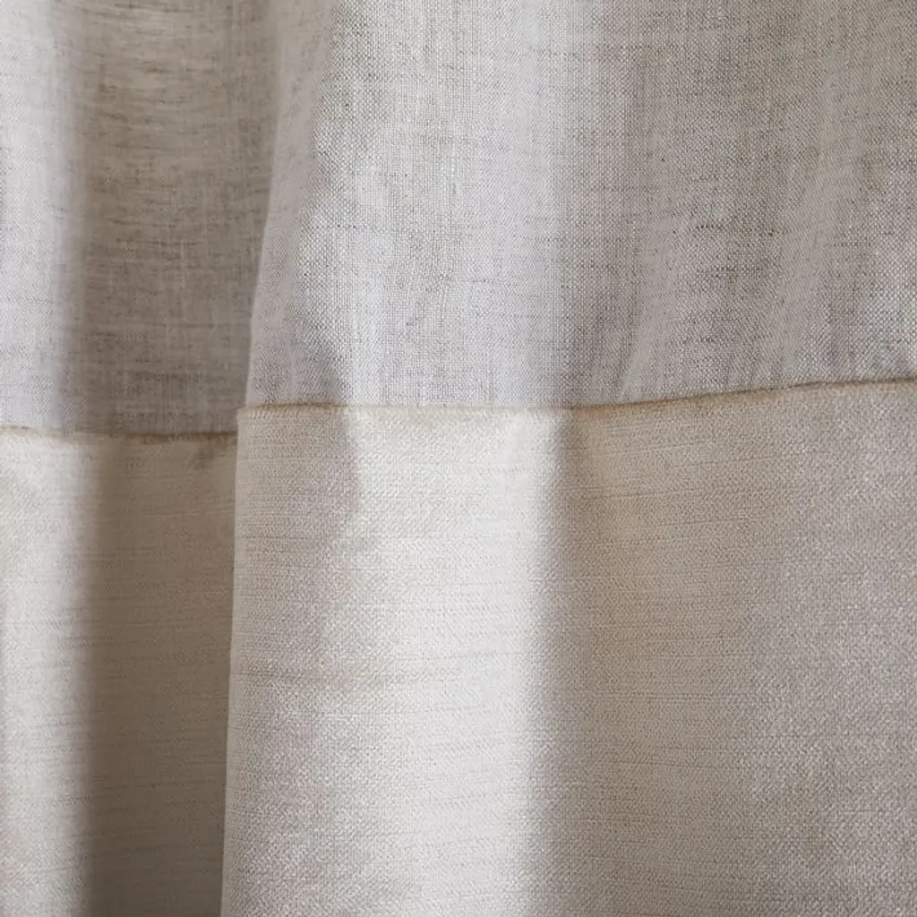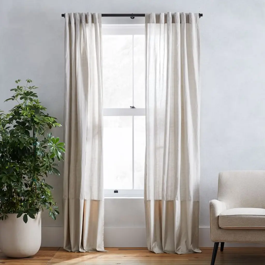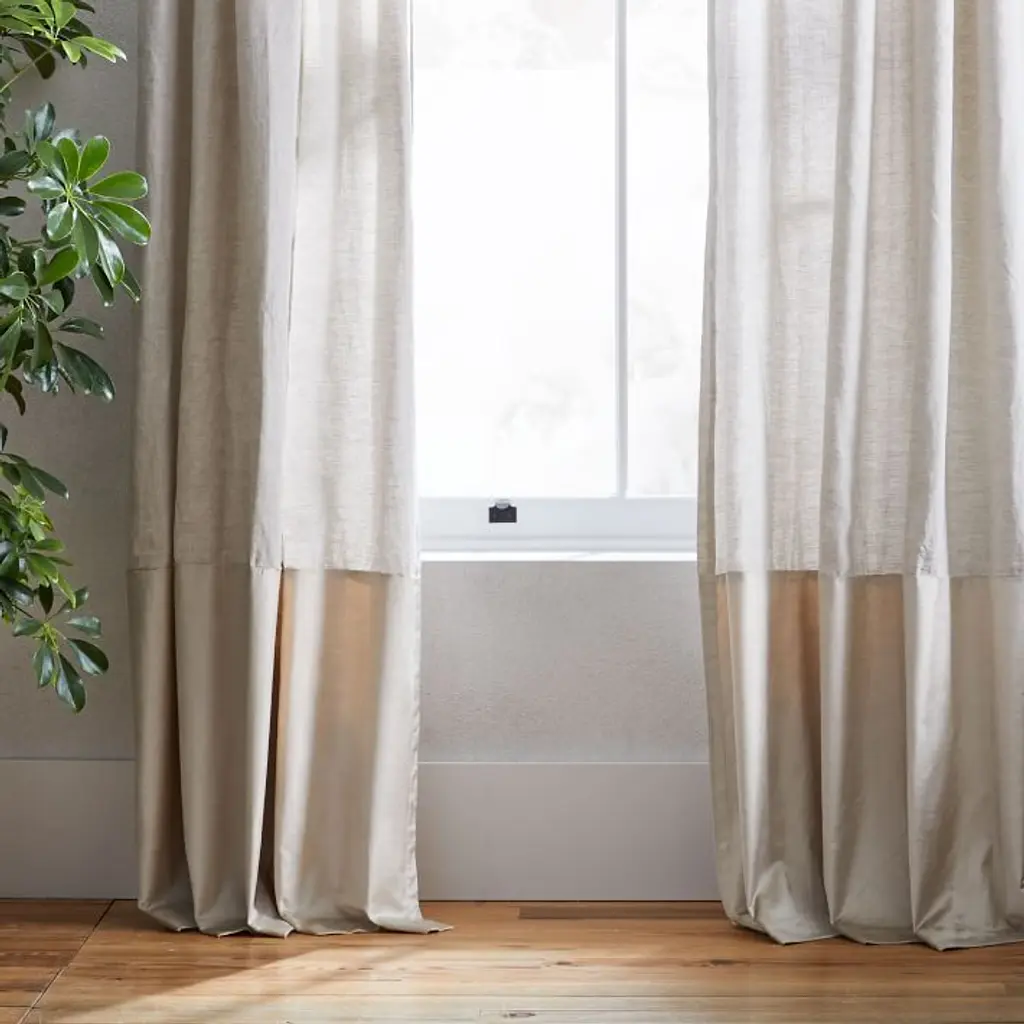A modern take on the color blocking trend, our European Linen & Luster Velvet Curtain brings together the best of two worlds: the textured, lived-in feel of fine European linen and the luxe, high-sheen finish of velvet. 100% European linen in Natural. Border: 60% cotton, 40% viscose in Sand. Opaque fabric blocks most light and helps insulate windows. Various lengths, all sizes 48"w. Pole pocket diameter: 4.25". 2-in-1 construction with dual hanging options: rod pocket (bunched) or back tabs (pleated). Coordinates with West Elm window hardware (sold separately). Each curtain panel sold individually or as a set of 2. Imagery reflects opacity of curtain when exposed to direct sunlight. Made in a Fair Trade Certified™ factory, empowering workers who made it. Linen woven from European-grown flax, constructed in China.