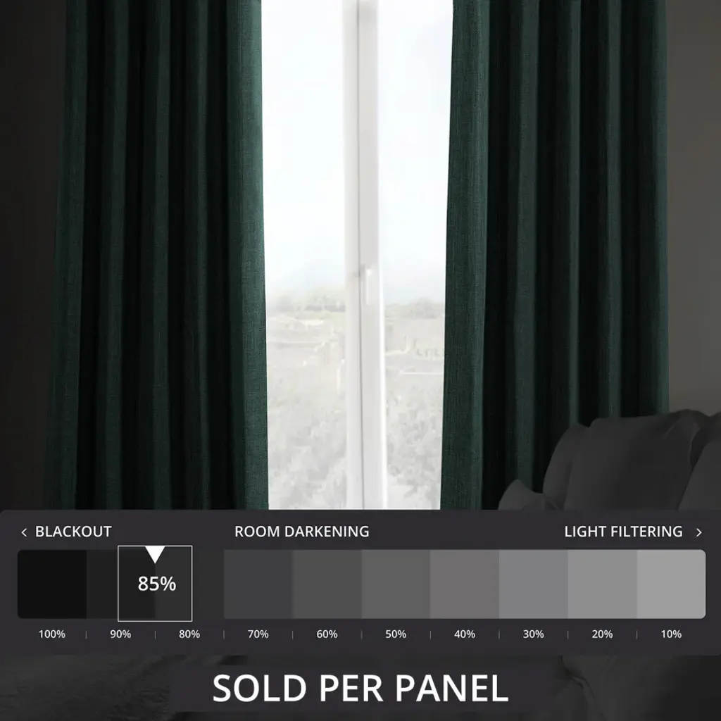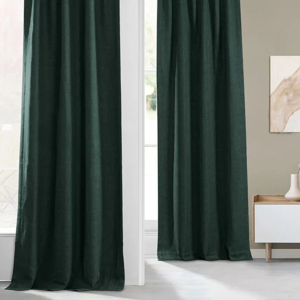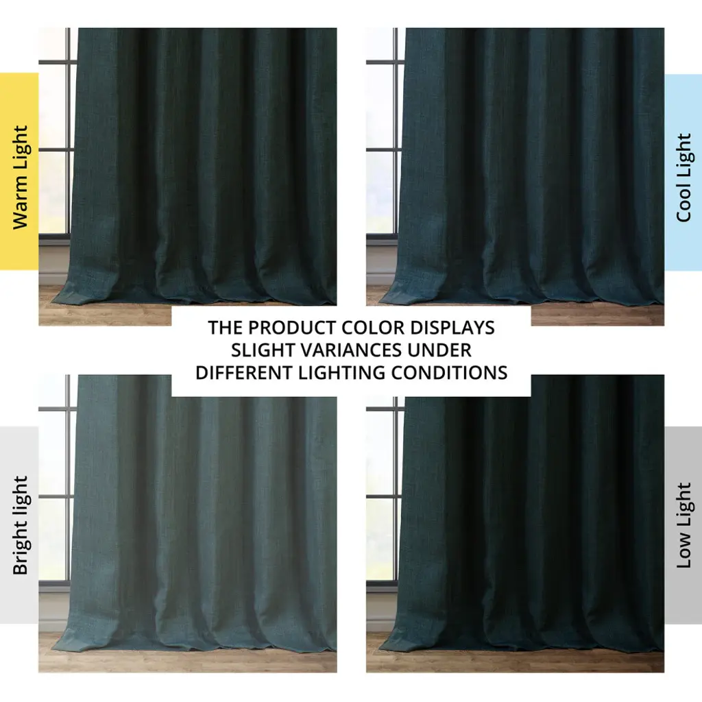 Our Faux Linen Room Darkening Curtain feature rich woven textures in modern designer colors for every style. These heavy faux linen panels have significant room darkening properties and a weighted hem to hang nicely and keep them in place. These curtains have our most versatile header, a rod pocket with back tabs and hook belt. There is a 3" pole pocket in the header and back tab loops that will accommodate up to a 1.5" diameter curtain rod with no additional hardware. Additionally, these panels can be attached to curtain rings from clips or by running an S-shaped drapery pin through the back of the header and hanging the drapery pin through an eyelet on the rings. These curtains are sold with no hardware like rings or hooks. We try to provide the most accurate digital images possible. Color may appear slightly different from one screen to another based on differences in computer monitors, brightness, and other selected settings so there may be variations in color between the actual product and the way it appears online.