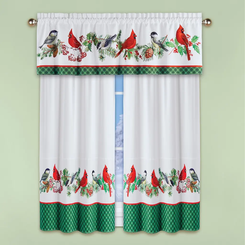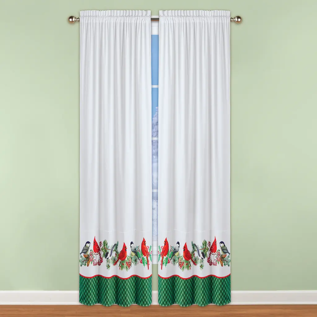 Beautiful pine branches, red berries, chickadees and bright red cardinals make these colorful curtains the perfect way to dress your windows for the holidays. The charming birds perch along the evergreen garland against an white background, with a festive green plaid border along the bottom. Rod pocket tops make hanging easy. Machine wash. Polyester; imported. Choose: Valance (17"L x 54"W), 63" Panel Pair (63"L x 45"W each) or 84" Panel Pair (84"L x 45"W each).