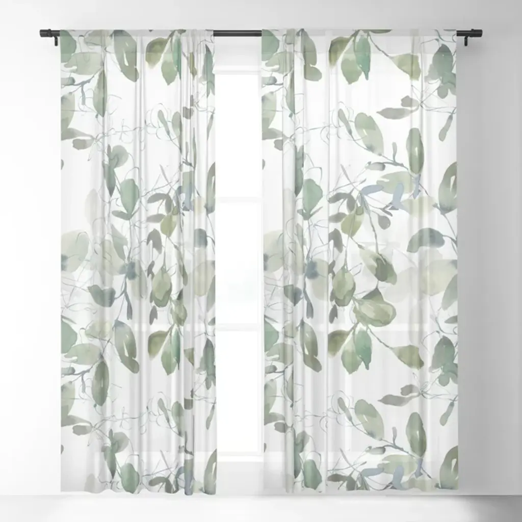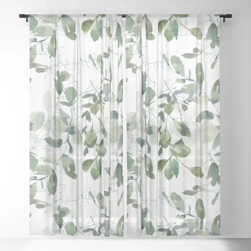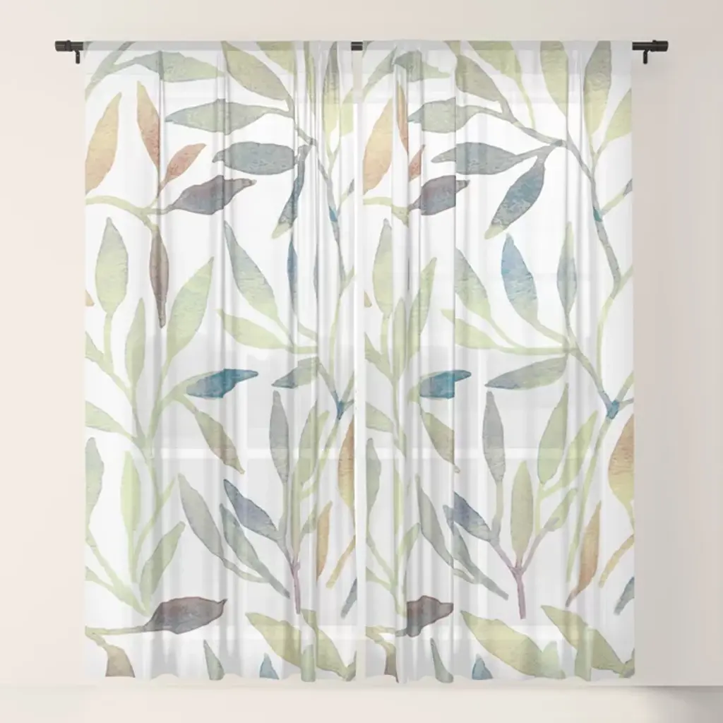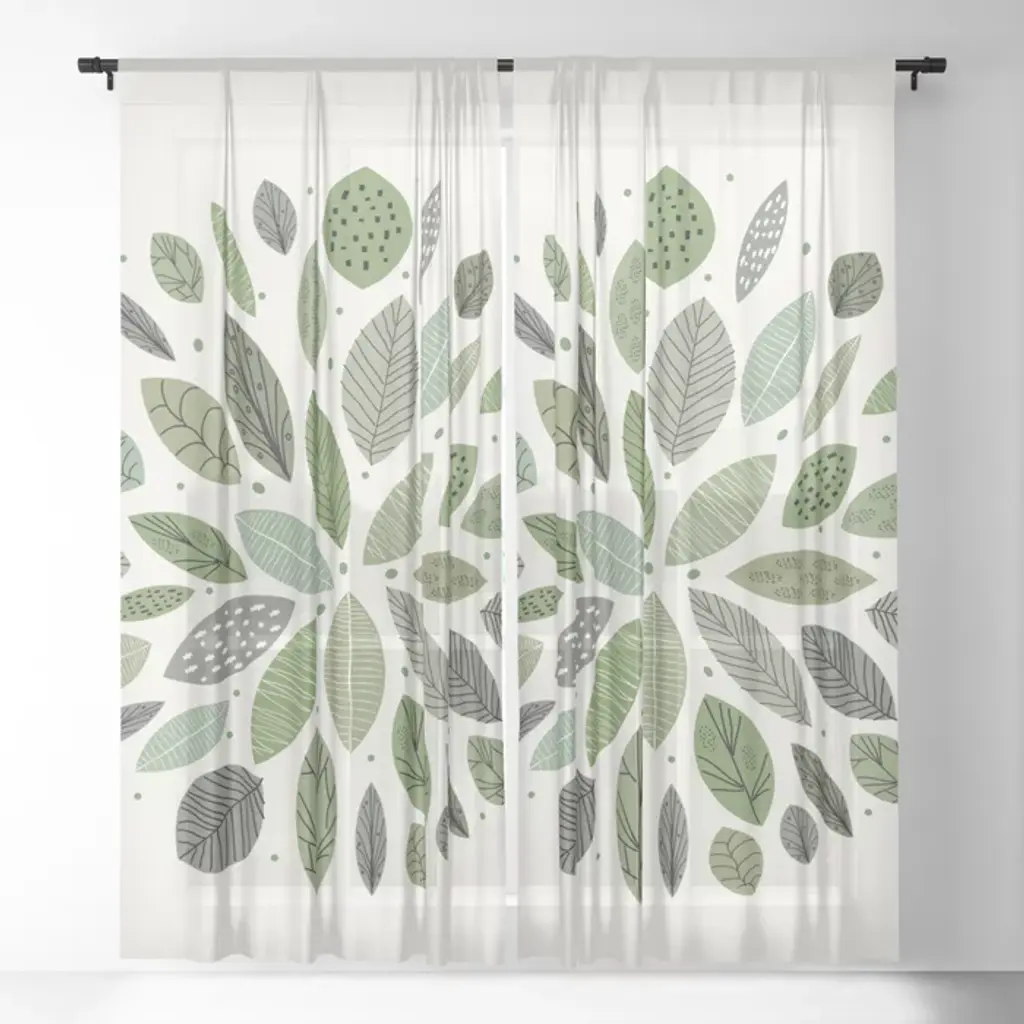 Festive, Watercolor, Leaves Print, White And Green Curtain