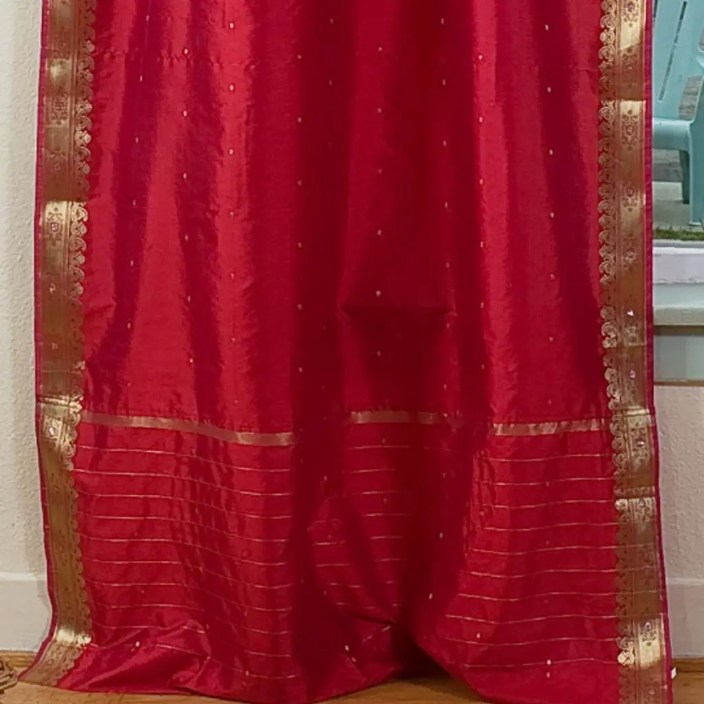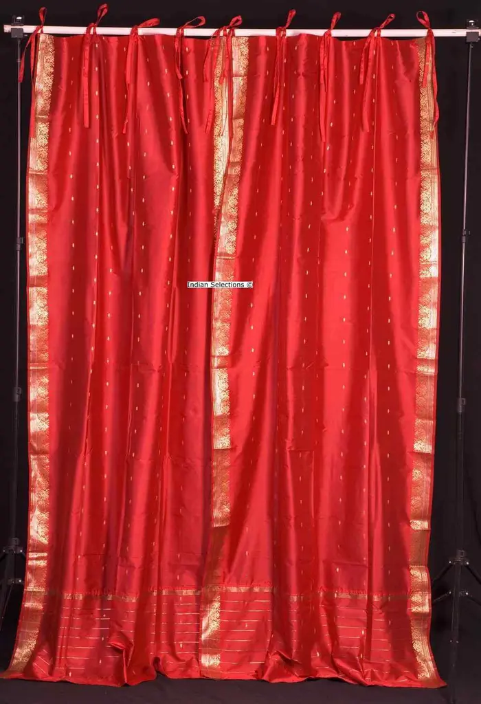 Add splendor to any room in your home with these Tie Top sari sheer curtains from India. These handmade drapes are heavily bordered with excellent artwork Sari Curtains / Drapes / Panels are the perfect choice for those looking for light, elegant drapes with a touch of luxury. It has smooth finish with a soft sheen and feels gentle and cool to the touch. Sheer curtains made of saris allow light in through windows but prevent people looking in when they are drawn. Story Behind the Art: The fabric of these curtains are weaved on a hand-loom in a small rural village in India and then hand-dyed. The artisans are a group of young hand-crafters who have moved from small villages to a big town in Central India and make various home decor items out of these exotic sari fabrics. This gives these wonderful artisans a way to have sustainable income via selling to the worldwide market on the internet. Your purchase supports local and home-based work where the artisans can easily tend to their families and pass these time-honored skills from one generation to the next.