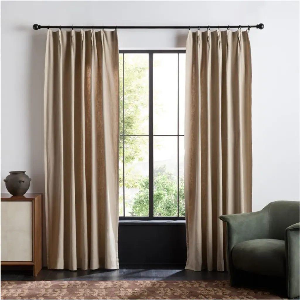 The classic French pleat curtain updates in a semi-sheer linen blend with crisp tailoring. Also known as a pinch pleat, the French pleat stitches together a neat, two-fold gather that draws eyes to the top of the panel while adding fullness to the drape. Lined in cotton, the woven curtains can be hung on their own or paired with sheer white panels or shades. Loop tabs in the back make it easy to attach curtain clips (sold separately).Try it on first. Since color representation may vary by screen, using a swatch is an easy way to see exactly how your favorite curtain panels will look in your home. Choose up to five free curtain swatches, and we'll ship them to you at no cost.Introducing The Collected Home. Our exclusive new collaboration with interior designer Jeremiah Brent is rich with bespoke details and bold individuality.Curtain hardware also available.Learn how to hang curtains in our guide.