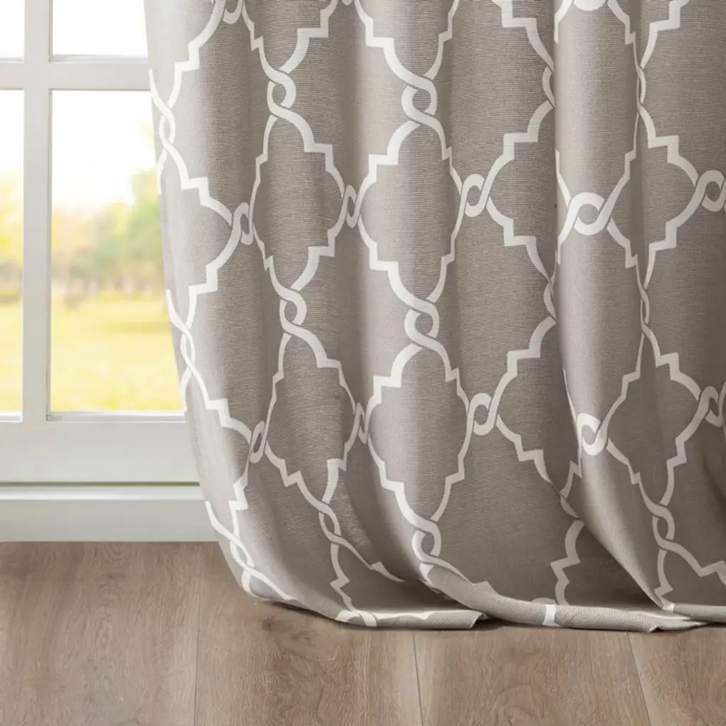 The Madison Park Saratoga Fret Print Panel is the perfect addition for a casual and stylish update to your home decor. This window panel features a trendy soft beige fretwork on a light grey ground, creating a simple yet modern look. The cotton blend basket weave fabric softly filters the perfect amount of sunlight into your home, while providing texture for natural appeal. Gunmetal grommet top detail makes this panel easy to hang, open, and close throughout the day. Fits up to a 1.25" diameter rod. Pattern position may vary per panel due to random cutting of fabric.