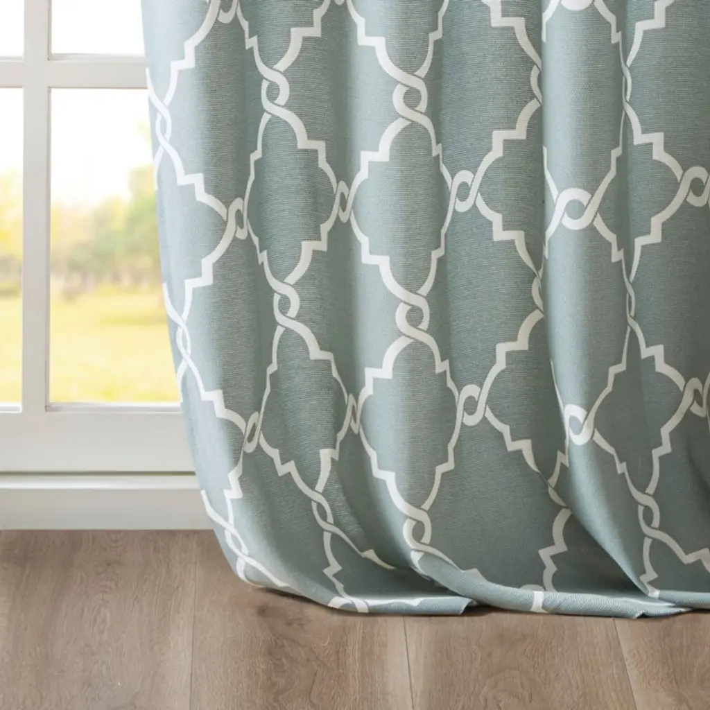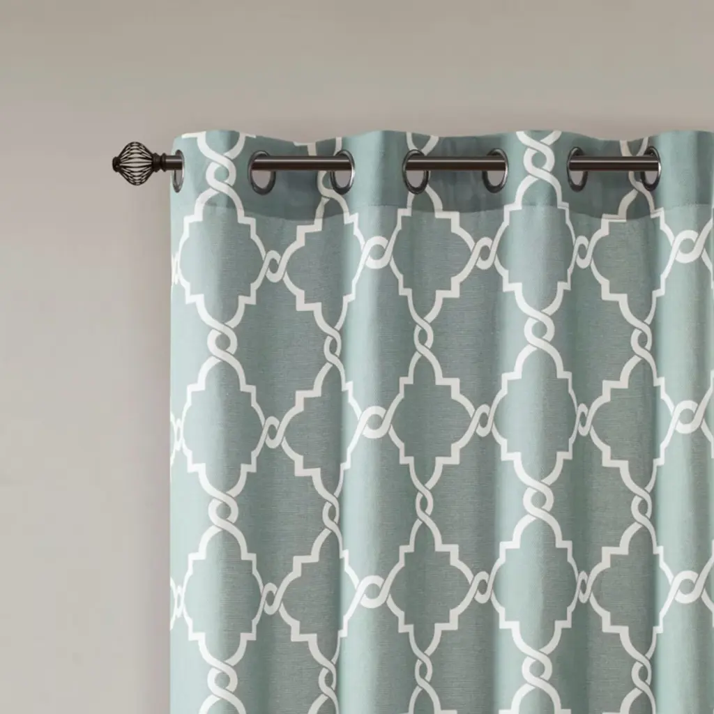The Madison Park Saratoga Fret Print Panel is the perfect addition for a casual and stylish update to your home decor. This window panel features a trendy light beige fretwork on a seafoam ground, creating a simple yet modern look. The cotton blend basket weave fabric softly filters the perfect amount of sunlight into your home, while providing texture for natural appeal. Gunmetal grommet top detail makes this panel easy to hang, open, and close throughout the day. Fits up to a 1.25" diameter rod. Pattern position may vary per panel due to random cutting of fabric.