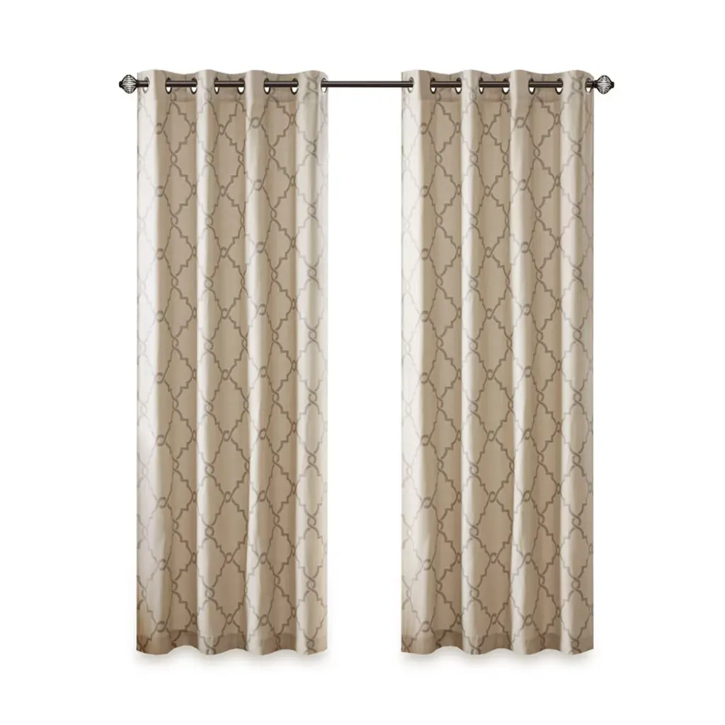 Description The Madison Park Saratoga Fret Print Panel is the perfect addition for a casual and stylish update to your home decor. This window panel features a trendy soft grey fretwork on a light beige ground, creating a simple yet modern look. The cotton blend basket weave fabric softly filters the perfect amount of sunlight into your home, while providing texture for natural appeal. Gunmetal grommet top detail makes this panel easy to hang, open, and close throughout the day. Fits up to a 1.25in diameter rod. Pattern position may vary per panel due to random cutting of fabric. Product Details 50x63in 1 Window Curtain:50x63in Material 68% poly 29% cotton 3% rayon; basket weave print, Grommet Top