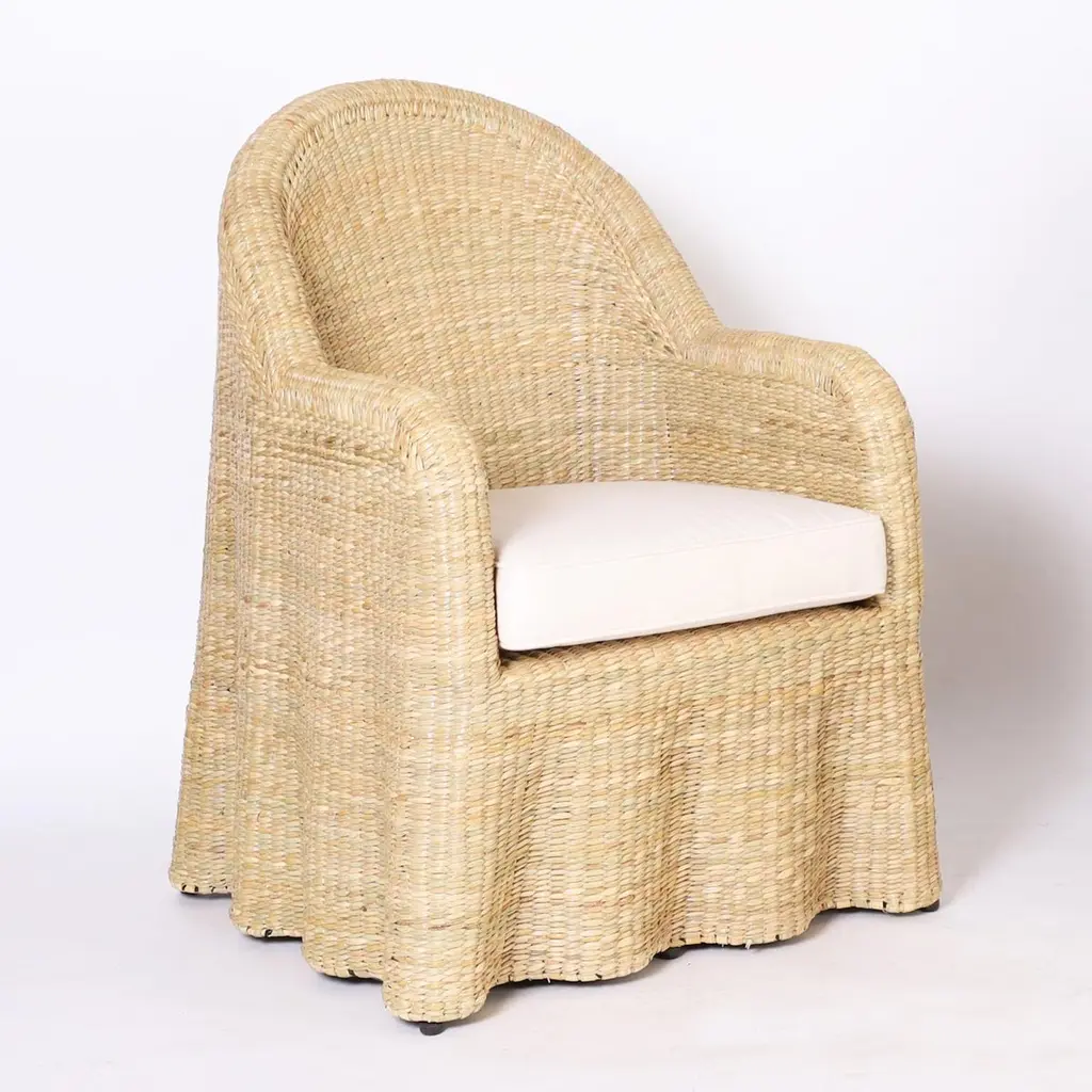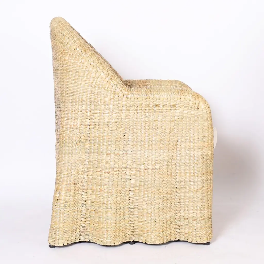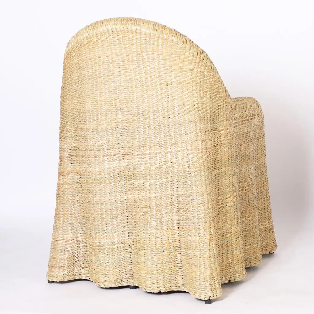 Chic midcentury inspired pair of ghost drapery armchairs handcrafted with a durable metal frame wrapped in reed with a tight elegant form, from the 2023 FS Flores Collection designed and manufactured exclusively by F.S. Henemader Antiques. Priced individually.