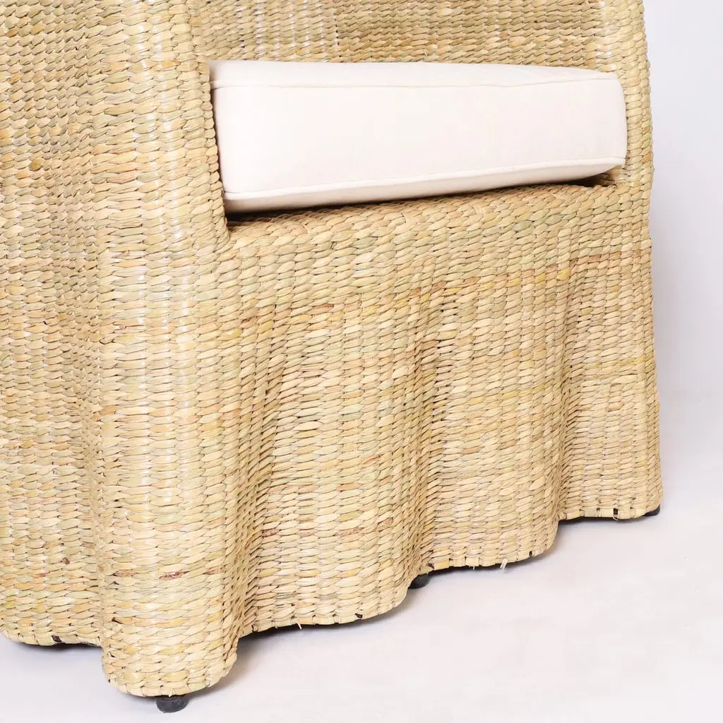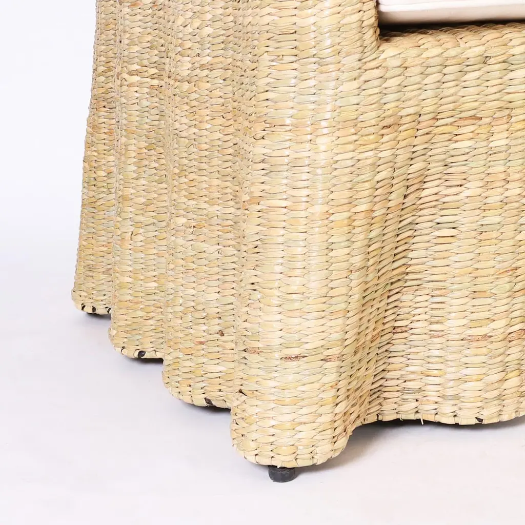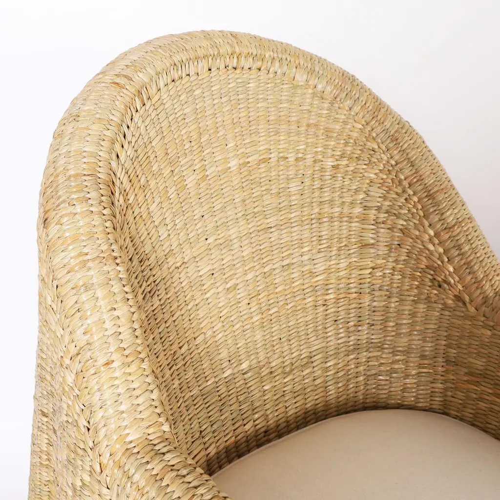 Chic midcentury inspired pair of ghost drapery armchairs handcrafted with a durable metal frame wrapped in reed with a tight elegant form, from the 2023 FS Flores Collection designed and manufactured exclusively by F.S. Henemader Antiques. Priced individually.