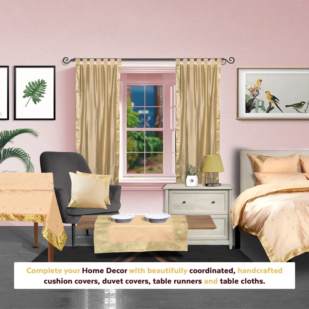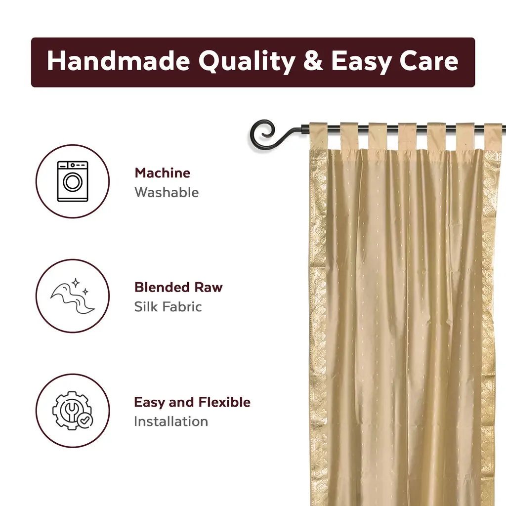 Add splendor to any room in your home with these Tab Top sari sheer curtains from India. These handmade drapes are heavily bordered with excellent artwork Sari Curtains / Drapes / Panels are the perfect choice for those looking for light, elegant drapes with a touch of luxury. It has smooth finish with a soft sheen and feels gentle and cool to the touch. Sheer curtains made of saris allow light in through windows but prevent people looking in when they are drawn. Story Behind the Art: The fabric of these curtains are weaved on a hand-loom in a small rural village in India and then hand-dyed. The artisans are a group of young hand-crafters who have moved from small villages to a big town in Central India and make various home decor items out of these exotic sari fabrics. This gives these wonderful artisans a way to have sustainable income via selling to the worldwide market on the internet. Your purchase supports local and home-based work where the artisans can easily tend to their families and pass these time-honored skills from one generation to the next.