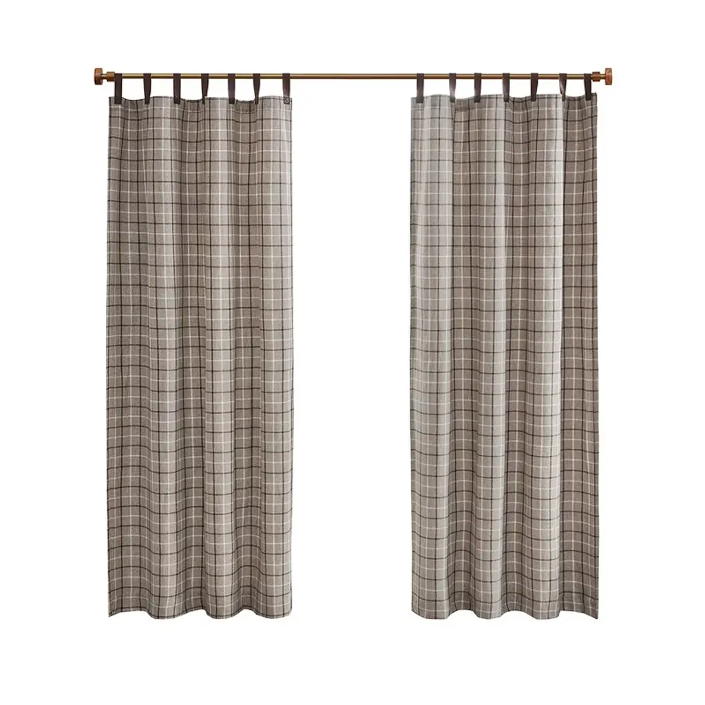 Introduce a touch of stylish rustic charm to your living space with the Anaheim Plaid Faux Leather Tab Top Panel featuring a rich brown plaid pattern on heavyweight fabric. The brown faux leather tab top adds a distinctive decorator's flair, while the fleece lining enhances privacy and thermal insulation without blocking natural sunlight. These machine-washable panels, available in 50" W and 84†L, are sold individually. For standard-size windows, it's recommended to use two panels