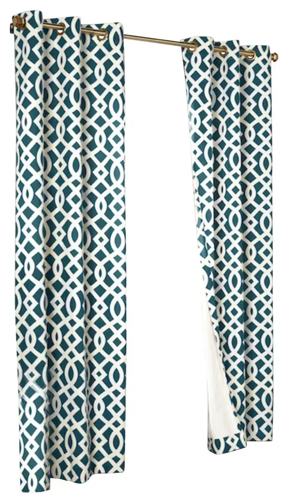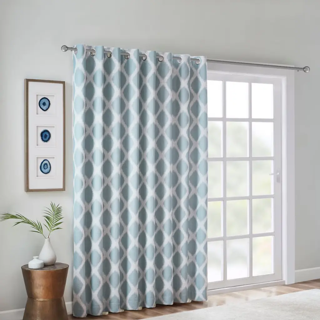 Experience a contemporary and stylish approach to energy efficiency with our Printed Ikat Blackout Patio Panel—an ideal enhancement for any room. This patio panel showcases a fresh and chic design featuring a printed aqua ikat pattern on a textured, firm base fabric, adding dimension for a cool and casual aesthetic. The panel is perfected with a two-pass foamback and bonding technique, elevating its ability to block most sunlight and creating a substantial barrier against outside noise. The silver grommet top detail ensures easy hanging, opening, and closing of the panels throughout the day, accommodating a standard 1.25†diameter rod. Offering significant energy savings and an elevated level of privacy, this blackout patio panel is perfect for wide or average window spaces, providing complete coverage with its extra width. Give your space a beautiful and unique update with this contemporary blackout patio panel, setting the lighting level to a Heavily Shaded Ambiance.