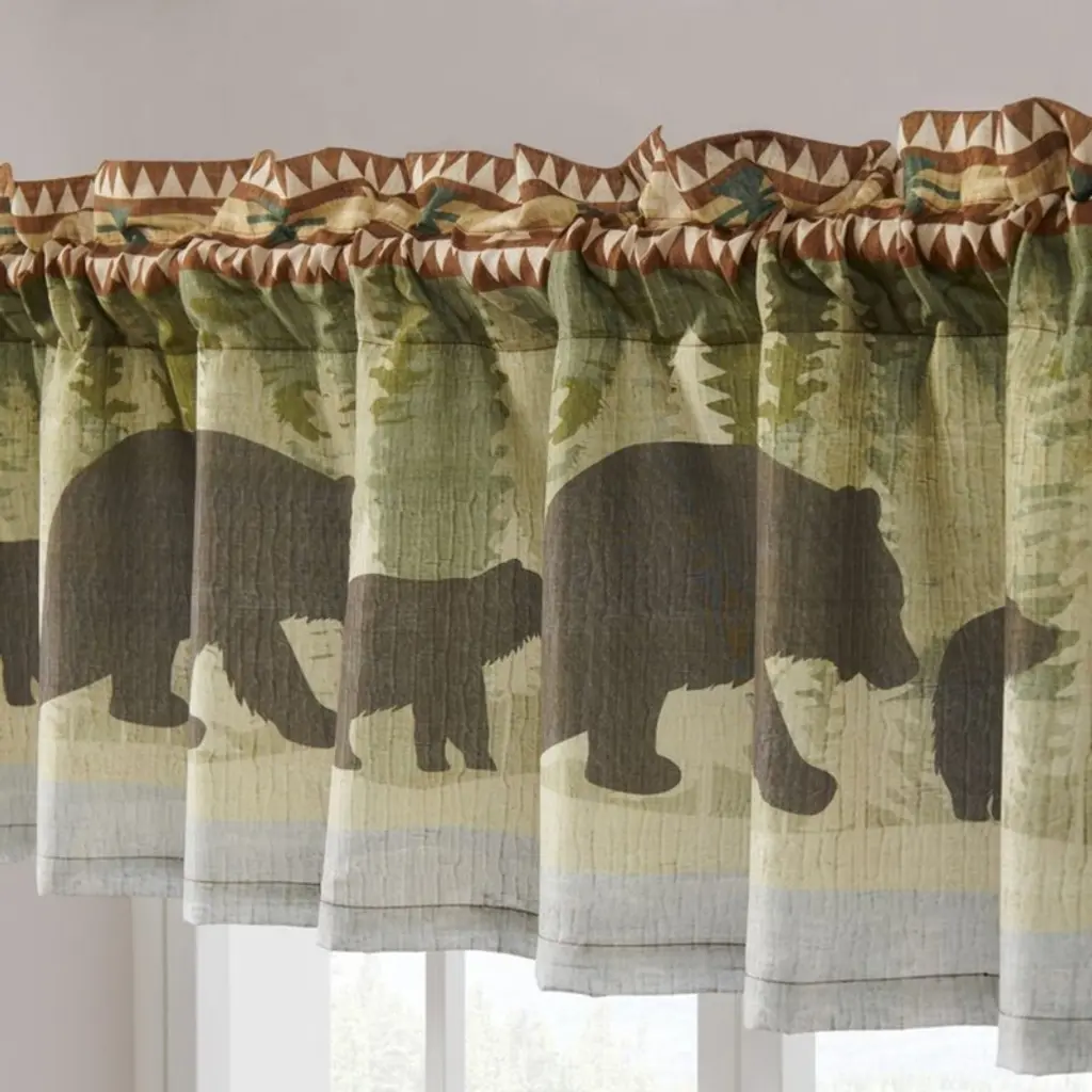 Add rustic charm to any space with the By the Lake window valance. Featuring lumbering bear beneath forested mountain scenery and bordered with decorative native motifs, the By the Lake light filtering window valance will compliment your Western, Lodge and Lakehouse décor. Extra wide valance measures 16 inches long from the top of the rod pocket and features a two-inch decorative header. Three-inch rod pocket along the top fits most rods for hanging. Made from machine washable 100% brushed microfiber and lined for increased privacy and sun protection. Perfect for your living room, bedroom or den, this valance brings your rustic sensibilities home.