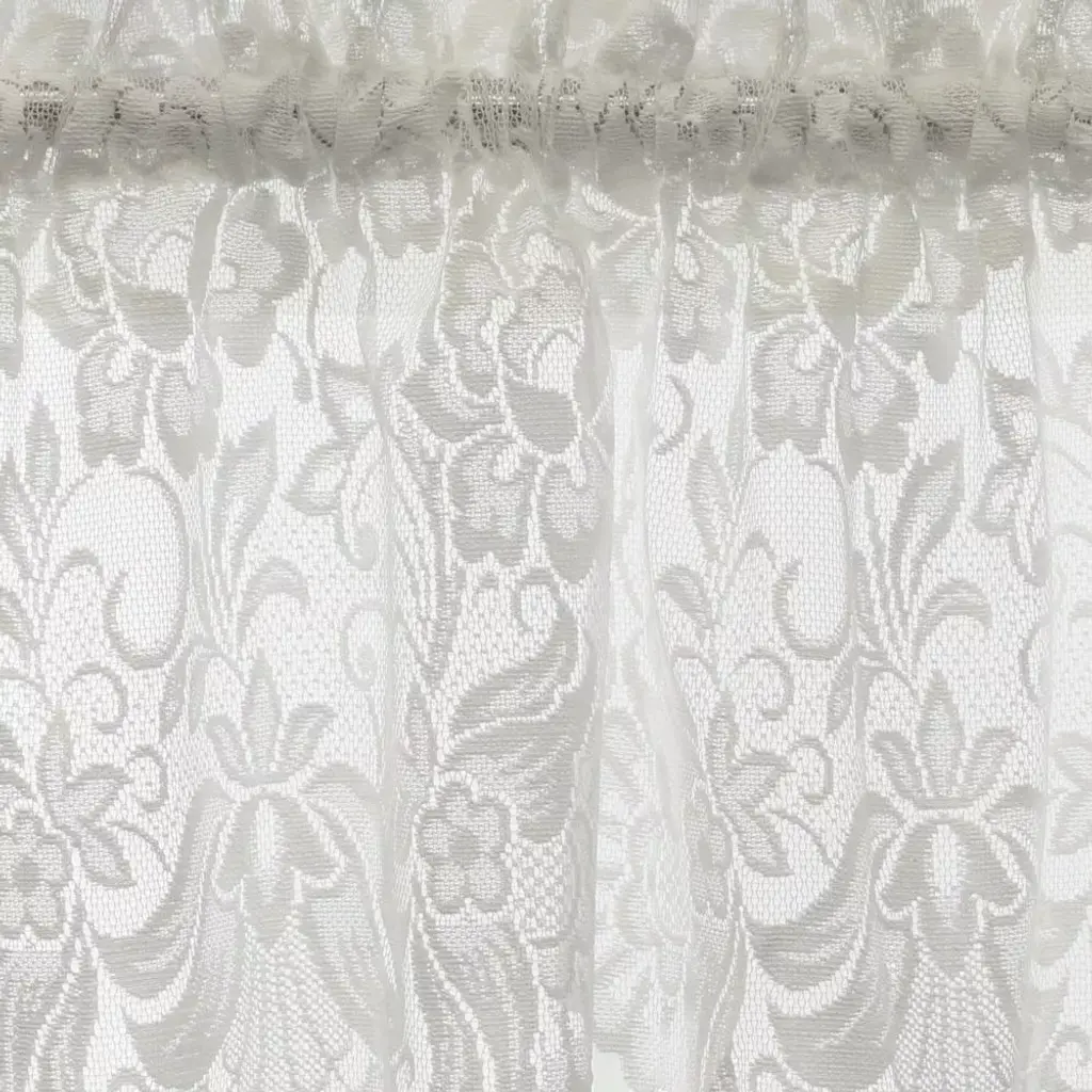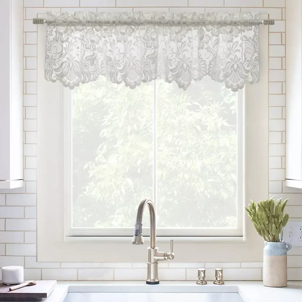 A rod pocket valance is a piece of fabric that hangs across the top of a window to hide other window treatment's hardware and add softness, color, and pattern. This particular valance is made from a lightweight lace fabric that allows natural light to filter through, while still providing some privacy. The romantic floral lace design is timeless and feminine, and the delicate scalloped bottom hem and selvedged sides add a touch of sophistication. Rod pocket valances with romantic floral lace design are a versatile and elegant addition to any home. They can be used in a variety of rooms, from the bedroom to the living room. They are also a great choice for formal occasions, such as weddings and parties. If you are looking for a timeless and elegant way to dress up your windows, rod pocket valances with romantic floral lace design are a great option.