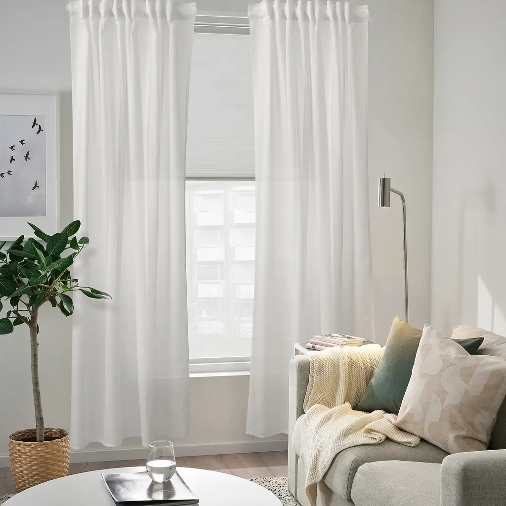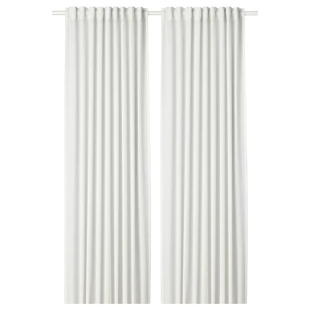 HILJA Curtains, 1 pair - white 57x84 ". The curtains let the light through but provide privacy so they are perfect to use in a layered window solution. The curtains can be used on a curtain rod or a curtain track. The heading tape makes it easy for you to create pleats using RIKTIG curtain hooks.