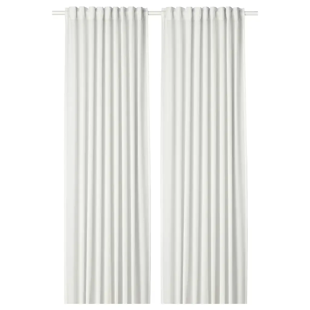 HILJA Curtains, 1 pair - white/with heading tape 57x98 ". The fabric dims daylight entering the room and reduces glare. It gives a comfortable sense of privacy as people cannot see in. At night, silhouettes can be perceived from outside when the room is lit. Curtains, 1 pair included
